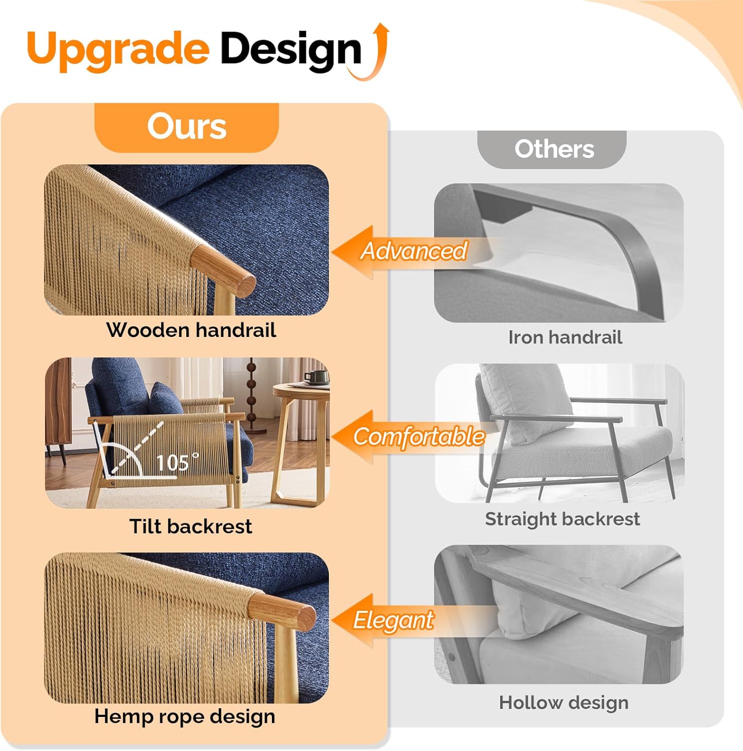 - Braid Design : The Boho-inspired Braid Accent Chair showcases elegant paper cord weaving across its angled armrests. Its thoughtful design combines comfort and style with a medium-height backrest and plush cushioning. This piece seamlessly blends casual and sophisticated interior comfort, perfect for home decoration.The two chairs will be shipped in separate packages. Please note that they may not arrive at the same time.
