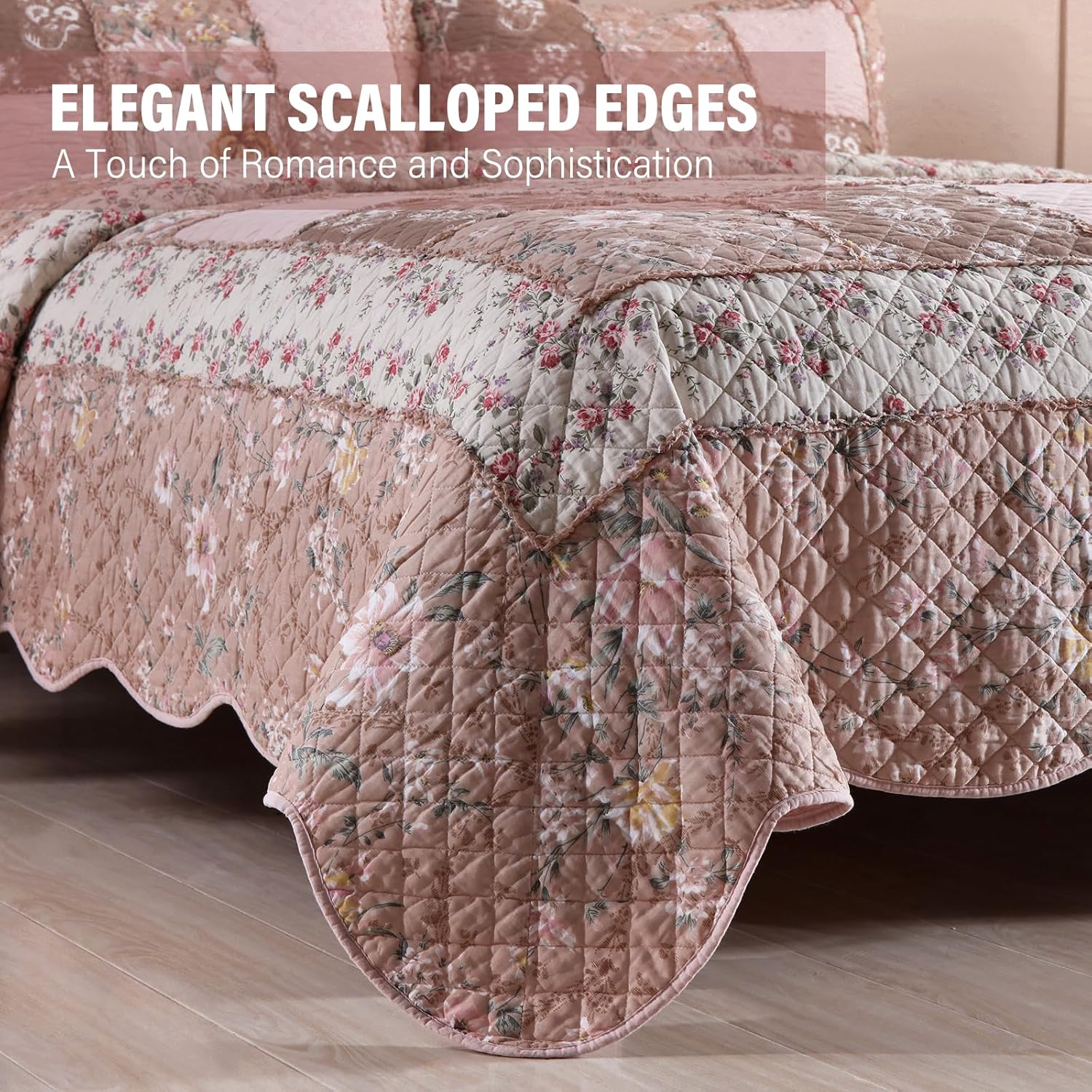 NEWLAKE Quilt Set Queen Size, Cotton Patchwork Pink Floral Quilt Sets, Real Stitched Embroidery Bedspread Lightweight and Breathable for All Seasons, Soft Quilted with 2 Pillow Shams