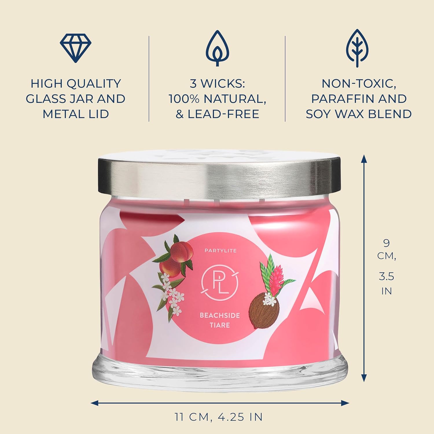 PartyLite Beachside Tiare Scented, Notes of Gardenia, Coconut, Red Hibiscus, Peach & Ylang Ylang, 13.2oz 3-Wick Jar Candle, 45 Hour Burn Time, Luxurious Fragrance, Ideal for Gifting
