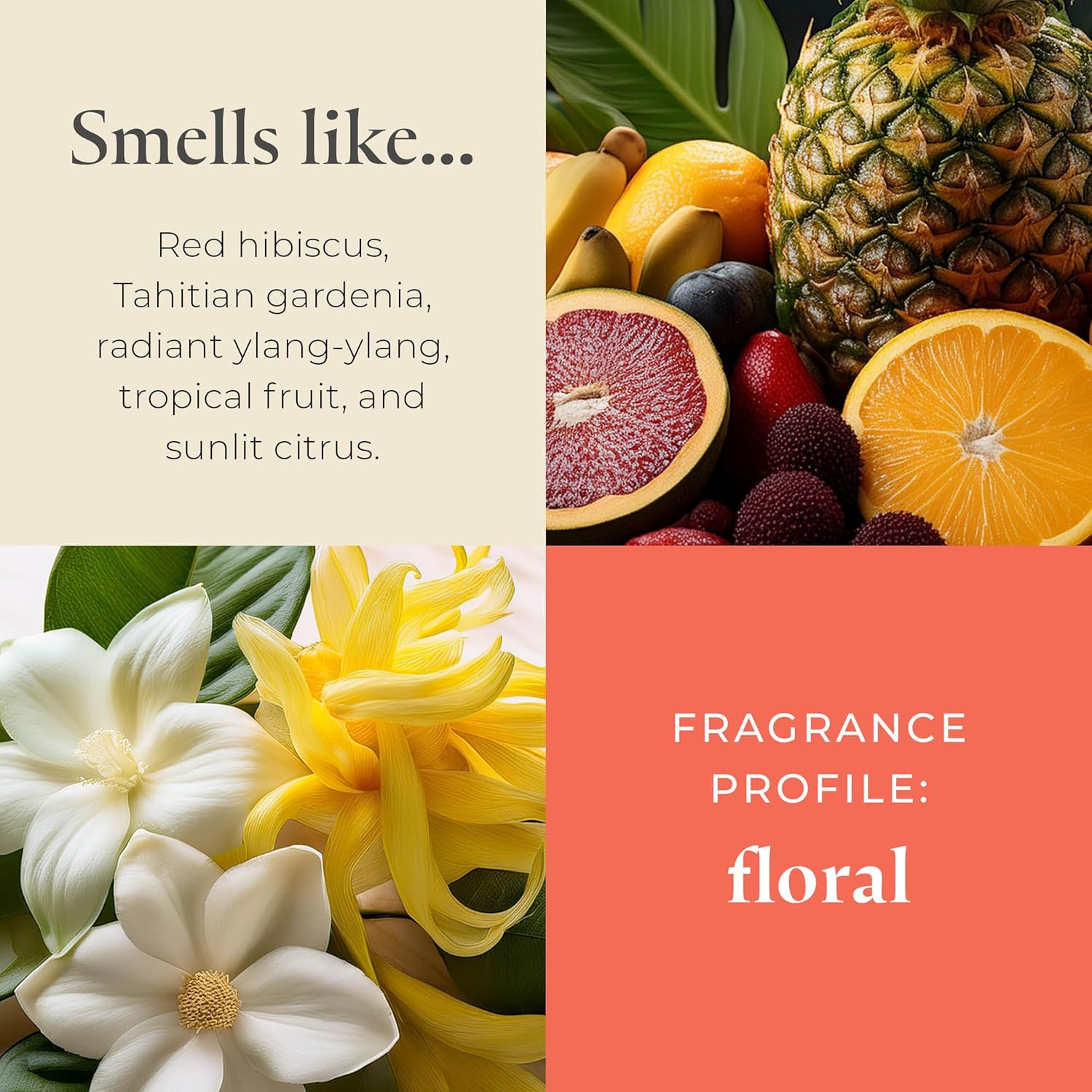 - EXPERTLY CRAFTED BLENDS: Infuse your space with a captivating, long-lasting fragrance. Top Notes: Citrus, Tropical, Coconut, Peach. Middle Notes: Red Hibiscus, Tahitian Gardenia, Ylang. Base Notes: Cedarwood, Musk.