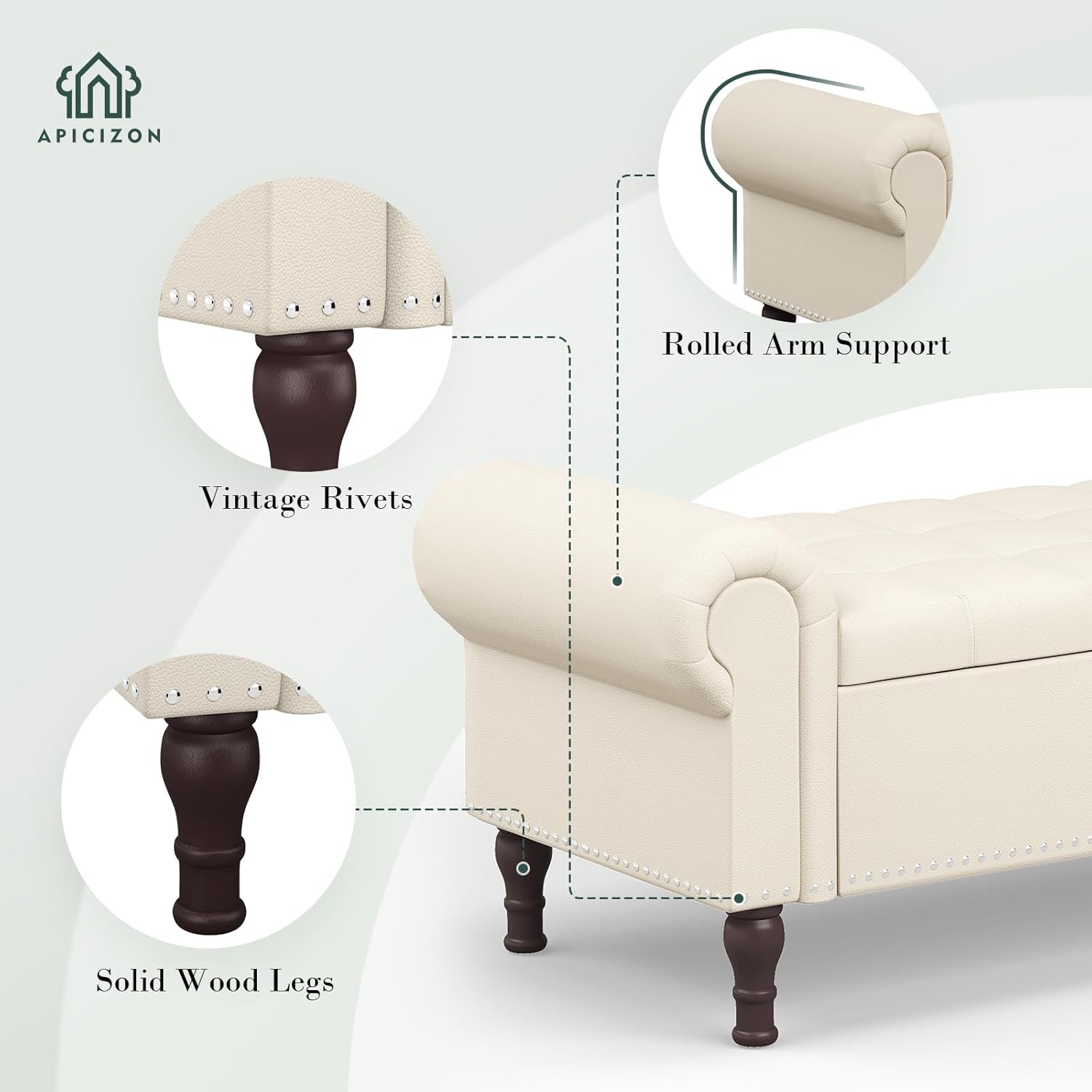 Apicizon 60”Storage Ottoman Bench, Soft Faux Leather Indoor Bench with Rolled Arm and Vintage Rivets, Large Storage Chest for Bedroom, Living Room, Entryway,Beige & Brown Legs