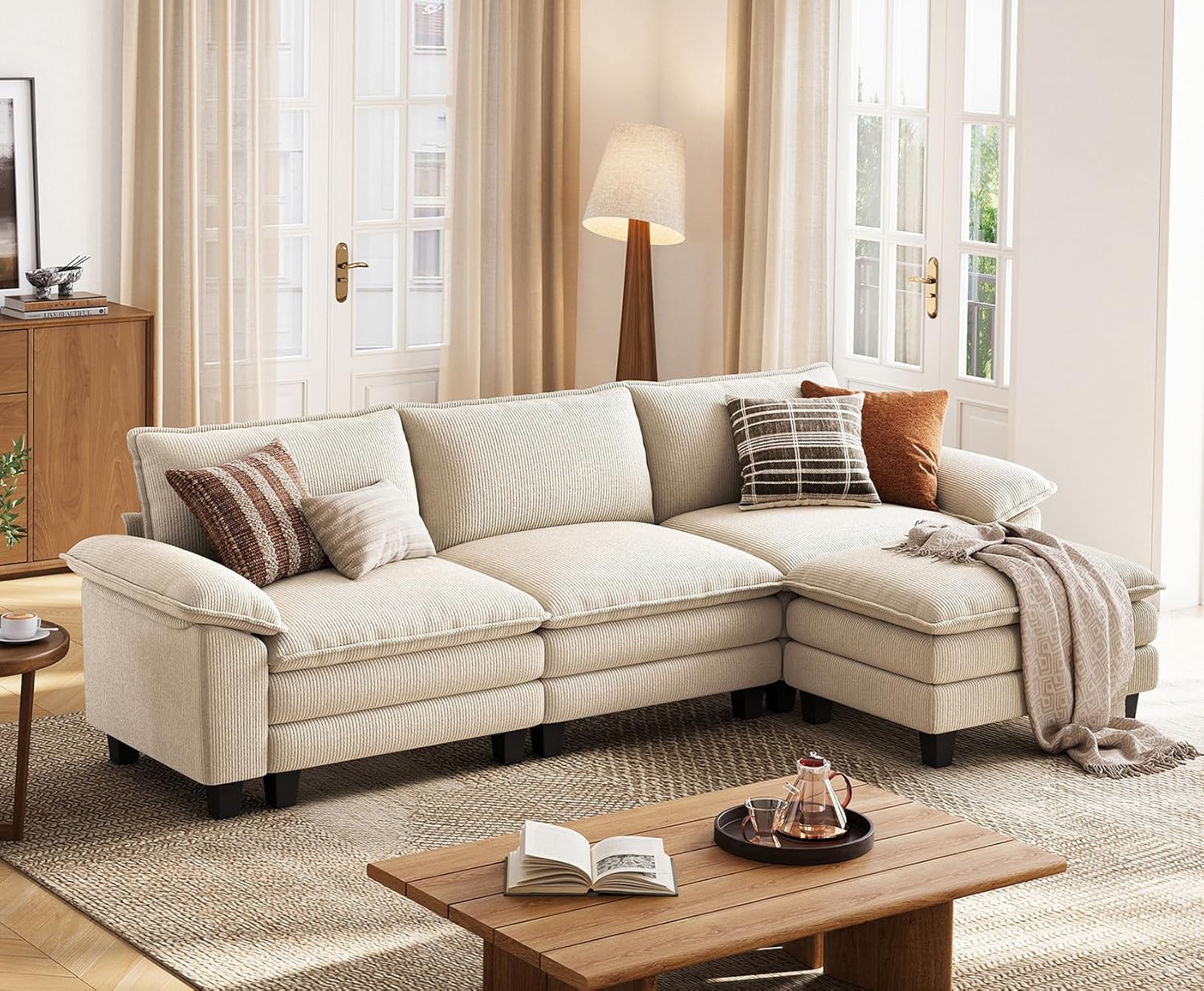 LINSY HOME Modular Sectional Sofa - 123'' Comfy Corduroy Cloud Sofa Oversized L Shaped Couch with Movable Ottoman, Soft Modern Sofa for Living Room Apartment, Beige