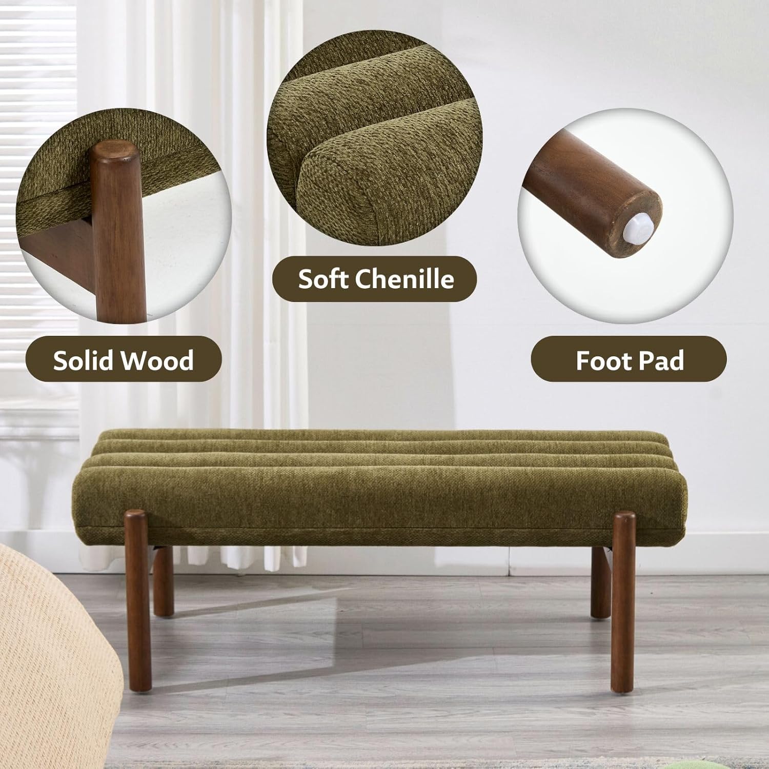 Green Upholstered Bench Modern End of Bed Bench Chenille Fabric Bedroom Bench for Entryway Living Room Vanity Makeup Room, 47" Long, Wooden Legs