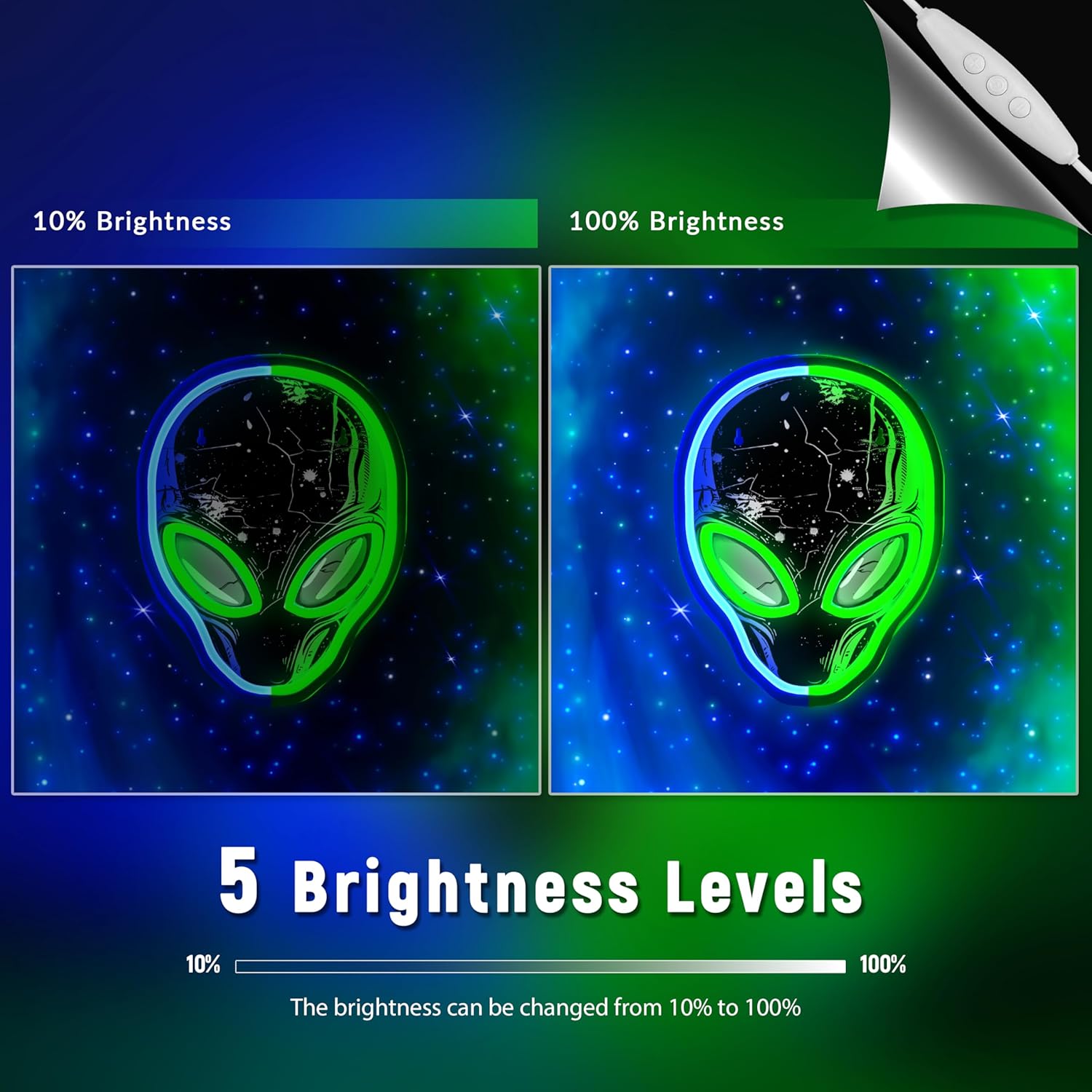 - UNIQUE DESIGN: With a fun and quirky alien design, this neon sign brings a playful yet futuristic vibe to any space. Featuring advanced UV printing technology, the sign adds a layer of mystery and immerses you in an otherworldly atmosphere. Lightweight yet sturdy, it can be mounted on the wall or displayed on a table as a stand-alone piece. The durable PVC exterior ensures no heat buildup, even with prolonged use, for a safe and enjoyable experience.