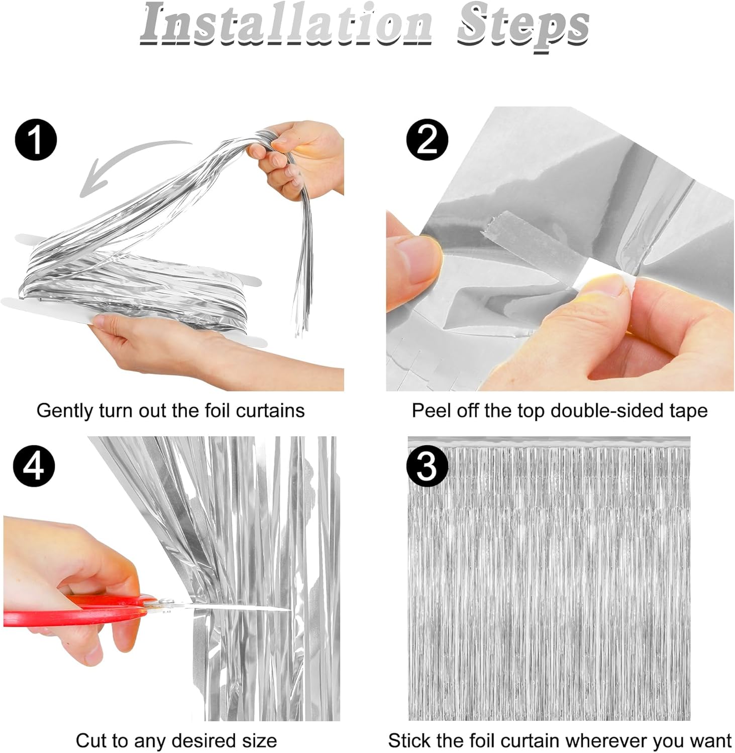 - Easy to Install: Each silver curtain comes with an adhesive strip at the top. Simply peel off the backing and stick the streamer backdrop to any smooth surface for a quick and hassle-free setup.