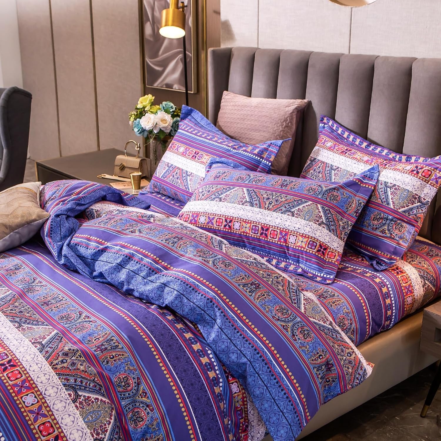 ABREEZE Bohemian Vintage Full Size Floral Cotton Bedding Set 3Pcs Duvet Cover Set Boho Purple Paisley 100% Egyptian Brushed Cotton Reversible Home Bedding Collection