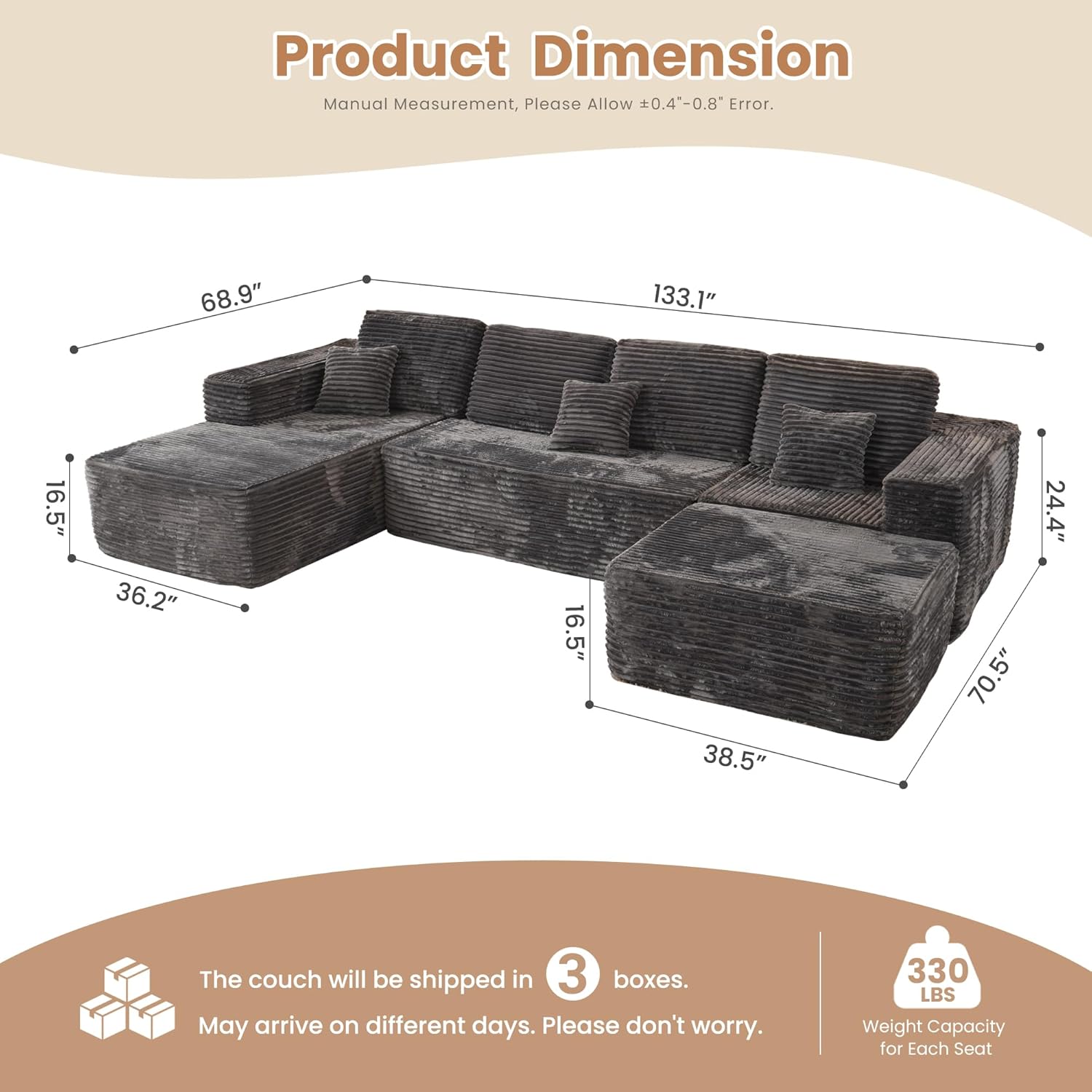 HOOOWOOO Cloud Sectional Couches for Living Room,Modular Sectional Sofa No Assembly,133X70 Inch Plush Corduroy Large U Shaped Floor Couch Set with Deep Seat Chaise Ottoman(Gray)