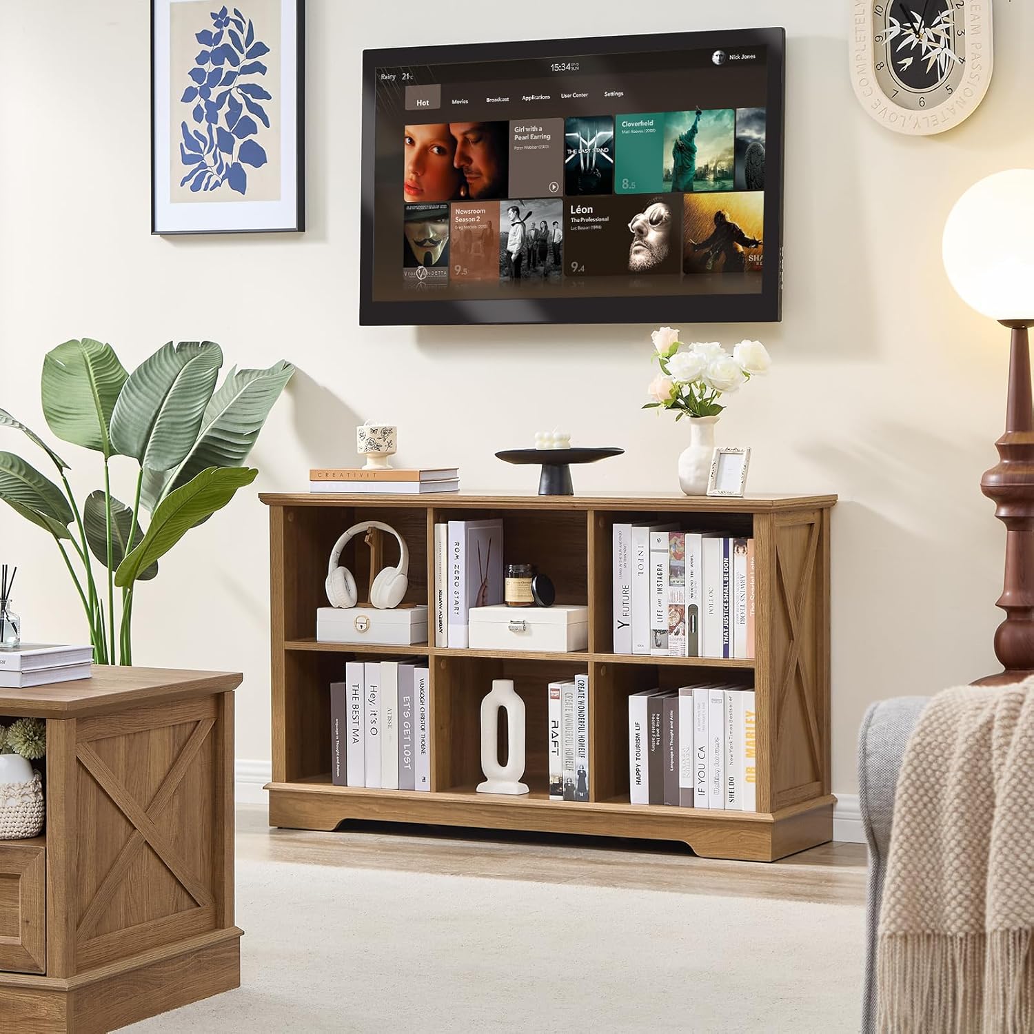 Farmhouse 6 Cube Bookshelf, Storage Organizer Bookcase, Kids Toy Storage Cabinet, Long Bookshelves Storage Organizer Shelf, Wood Display Cabinet Book Shelves for Bedroom,Living Room,Natural Oak
