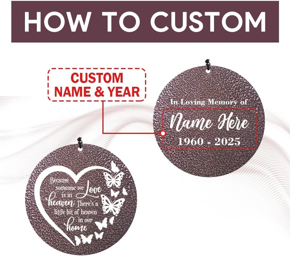 - šPersonalized Wind Chimes: With heart butterfly and some words like "Because someone we love is in heaven, there's a little bit of heaven in our home" on the one side of catcher, another side of catcher is customized the name&date you want. It provides peace and comfort to a grieving friend who has lost a loved ones such as parents and so on.
