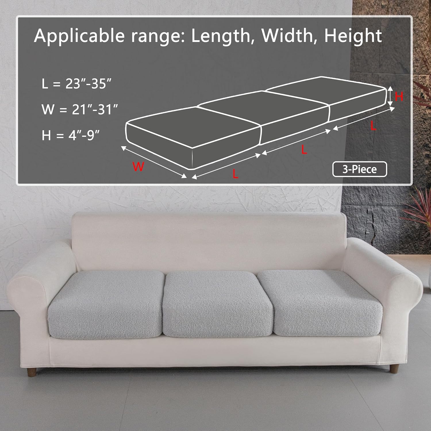 - 1.WHAT YOU WILL GET: 3*Seat Cushion Cover S. Suitable for sofa cushions with Length: 23-35 inches, Width: 21-31 inches, Height: 4-9 inches.This sectional couch cover is tailor-made for your sofa and can effectively resist stains, dust, pet hair and daily wear and tear.Made of soft Polar Fleece fabric, it adds a cozy and warm touch to your seat.