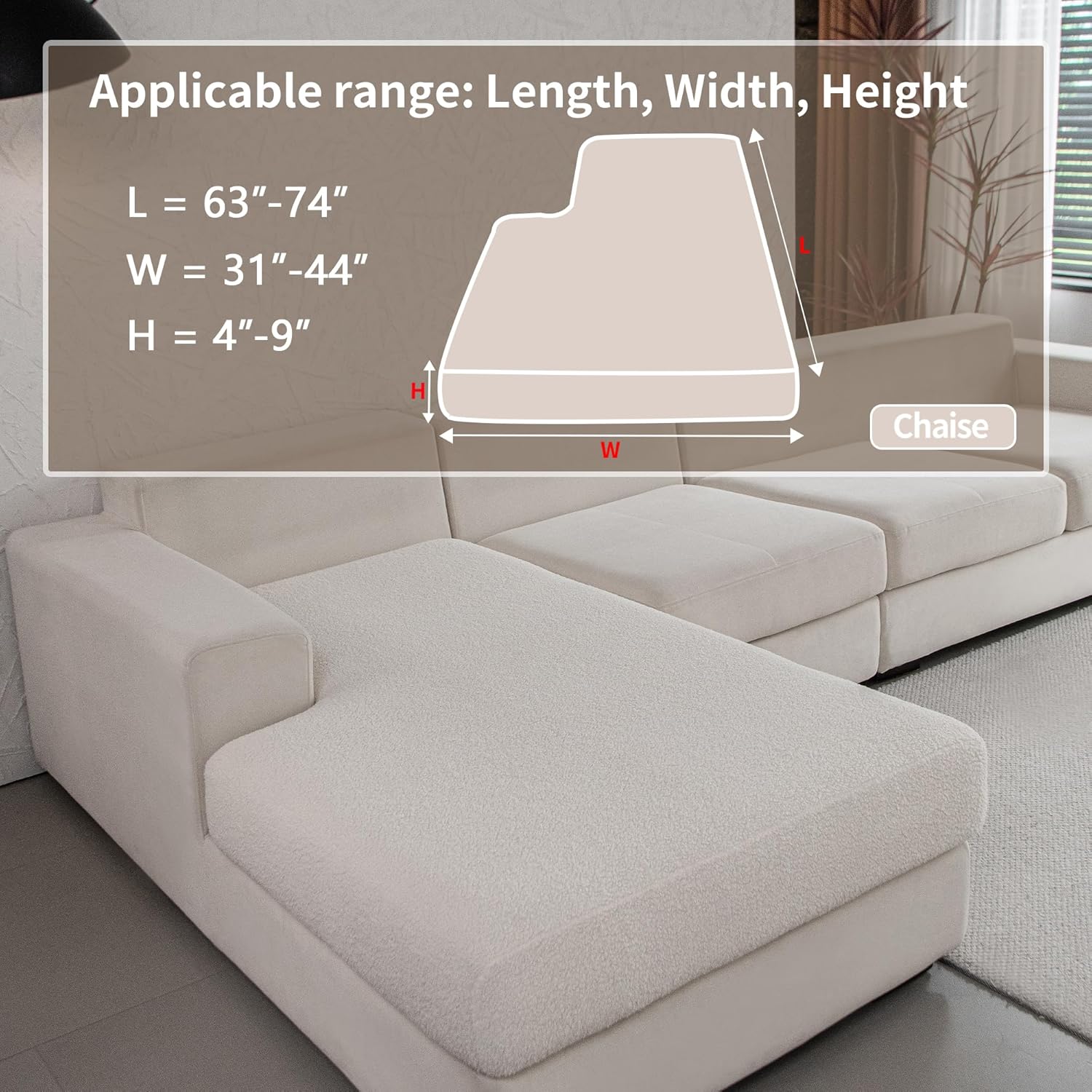 - 1.WHAT YOU WILL GET: 1*Chaise Cushion Cover. Suitable for sofa cushions with Length: 63-74 inches, Width: 31-44 inches, Height: 4-9 inches.This sectional couch cover is tailor-made for your sofa and can effectively resist stains, dust, pet hair and daily wear and tear.Made of soft Polar Fleece fabric, it adds a cozy and warm touch to your seat.