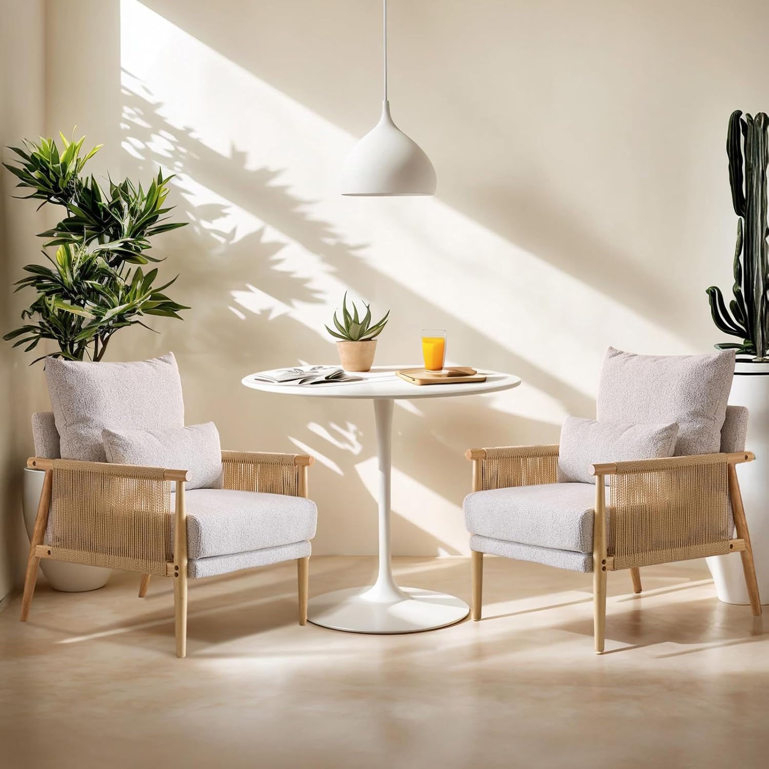 VINGLI Boho Braid Accent Armchairs Set of 2,Mid-Century Modern Chiars with Solid Wooden Armrest,Comfy Louge Cushion Chairs with Waist Pillow for Bedroom,Living Room,Reading Room, Light Grey