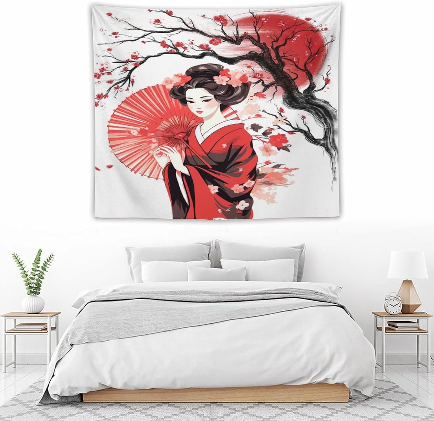 Japanese Red Geisha Tapestry Asian Cherry Blossom Traditional Kimono Folk Tapestries Home Decor for Living Room Bedroom Apartment Farmhouse Dorm 60"x50"