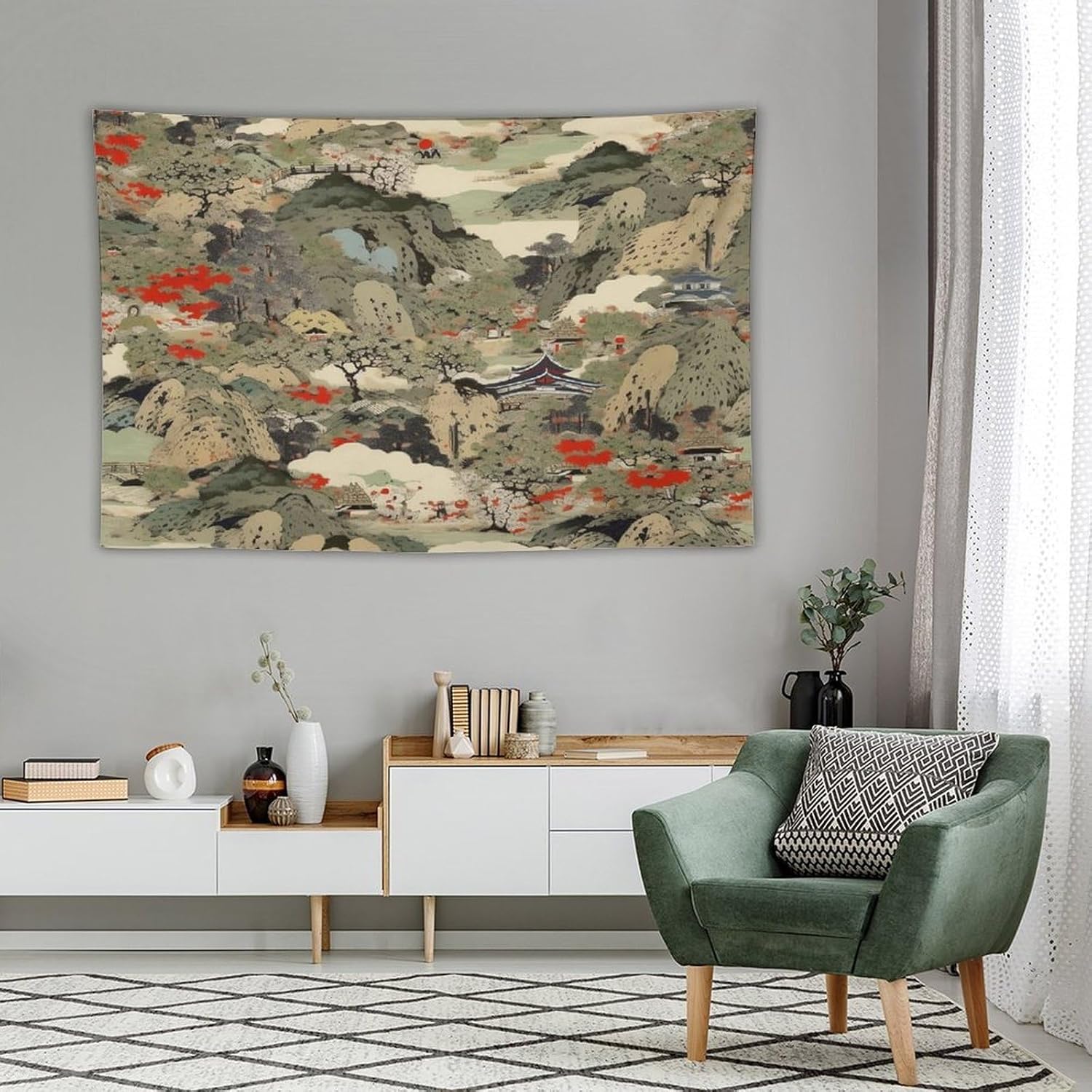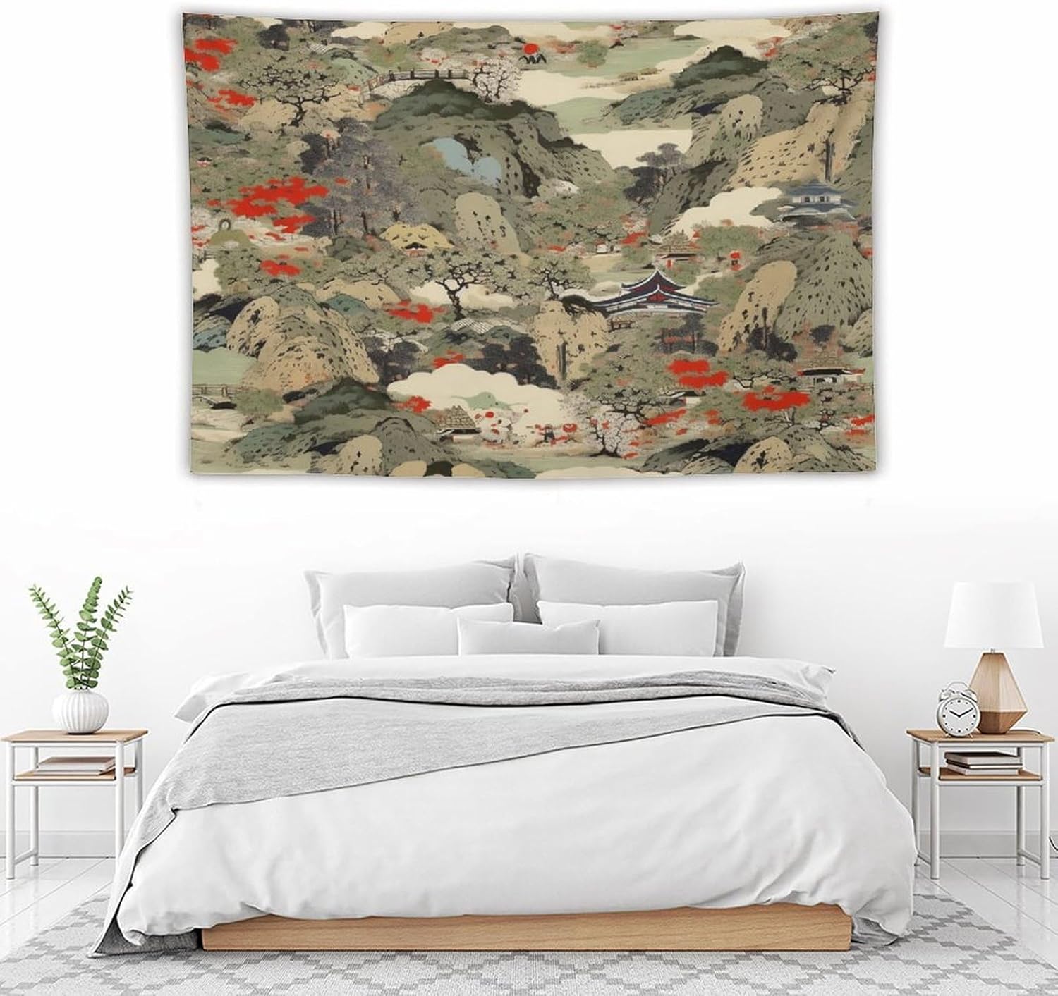 Asian Tapestry,Japanese Red Landscape Asian Watercolor Abstract Art Tapestry, Asian Japanese Wall Tapestry, Nature Landscape Tapestries for Bedroom Living Room Decor 90"x60"