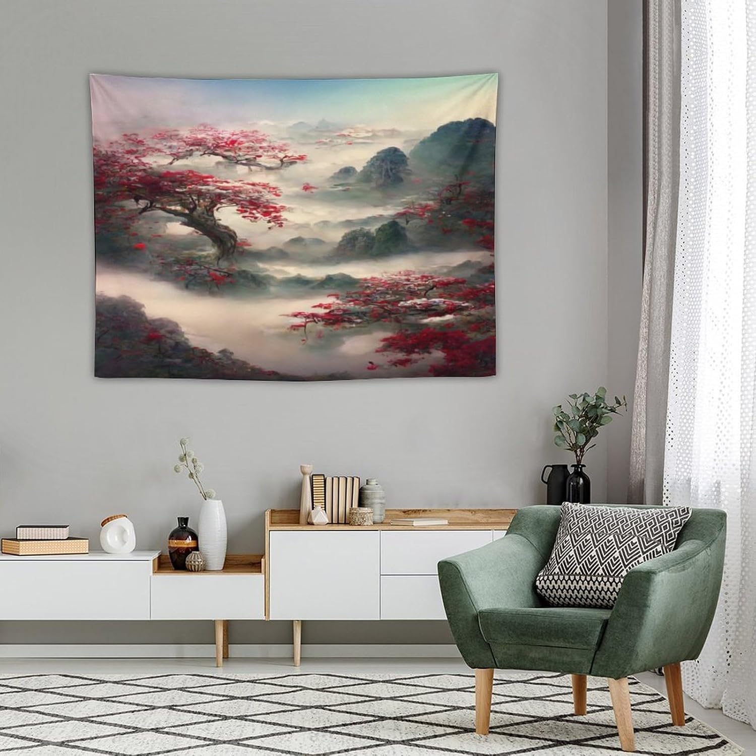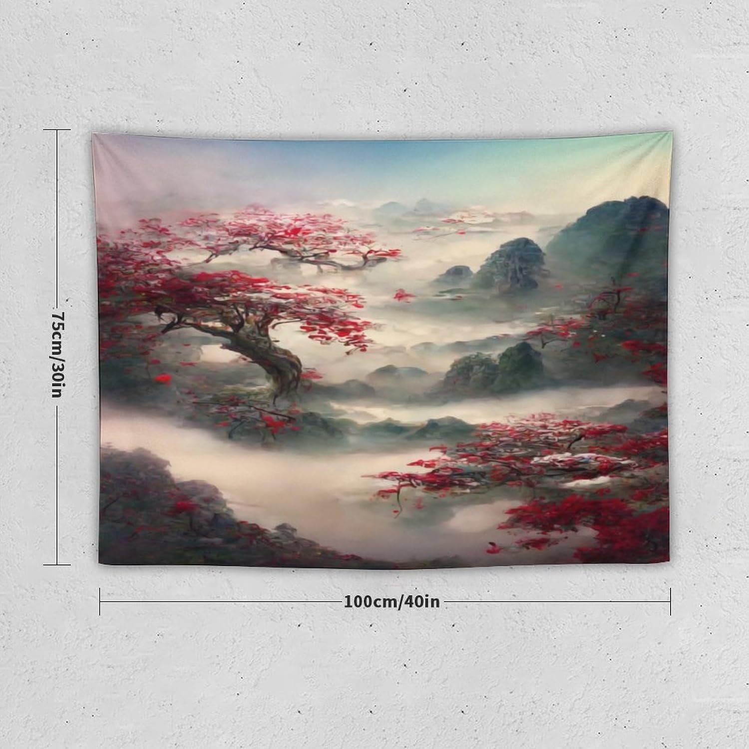 Houselerax Japanese Tapestry, Red Plum Cherry Blossom Mountain Tapestries, Asian Japanese Wall Decor, Nature Landscape Tapestries for Bedroom Living Room Decor 40"x30"