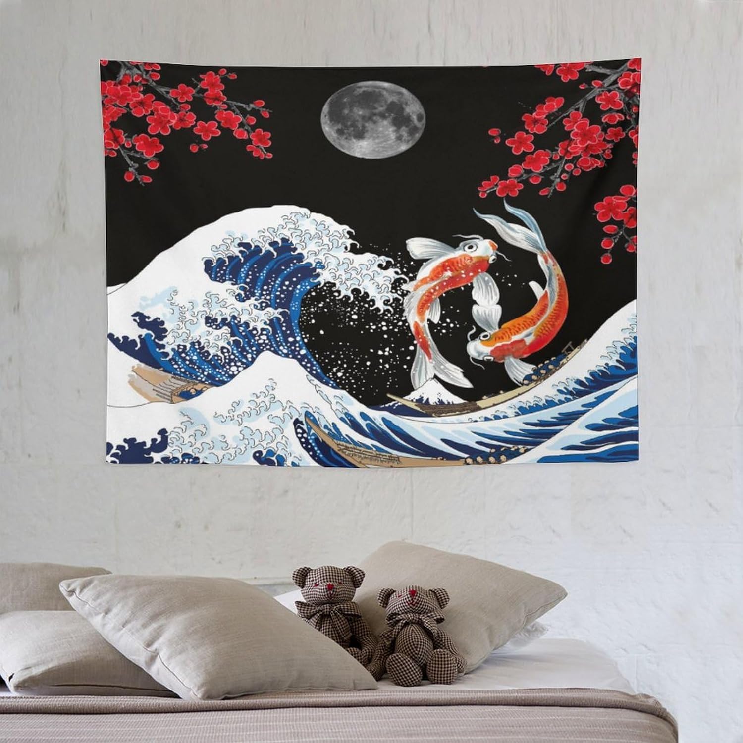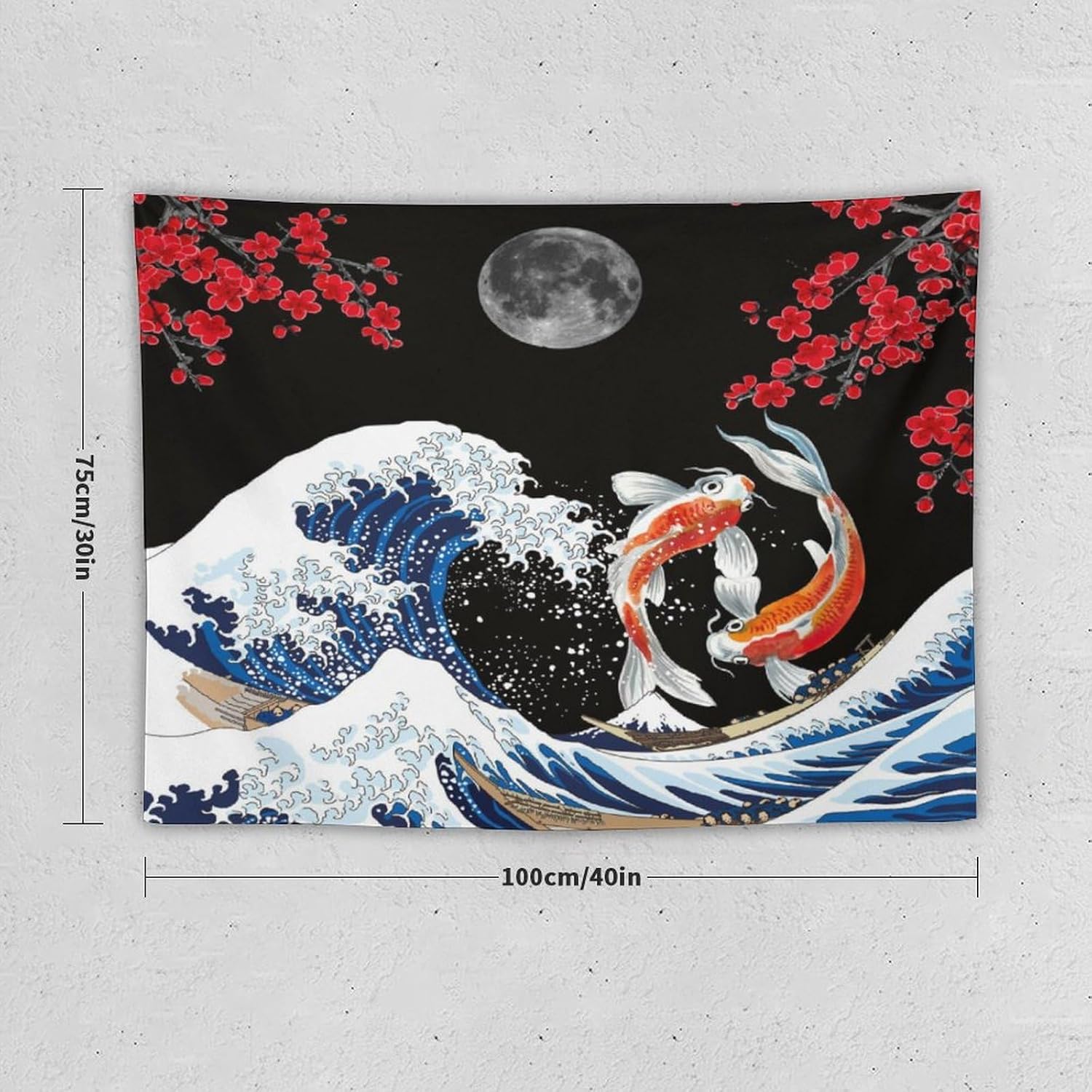 Houselerax Japanese Koi Fish Tapestry, Yin Yang Big Wave Red Cherry Blossom Tapestries Wall Hanging for Bedroom Living Room Office Decor 40"x30"