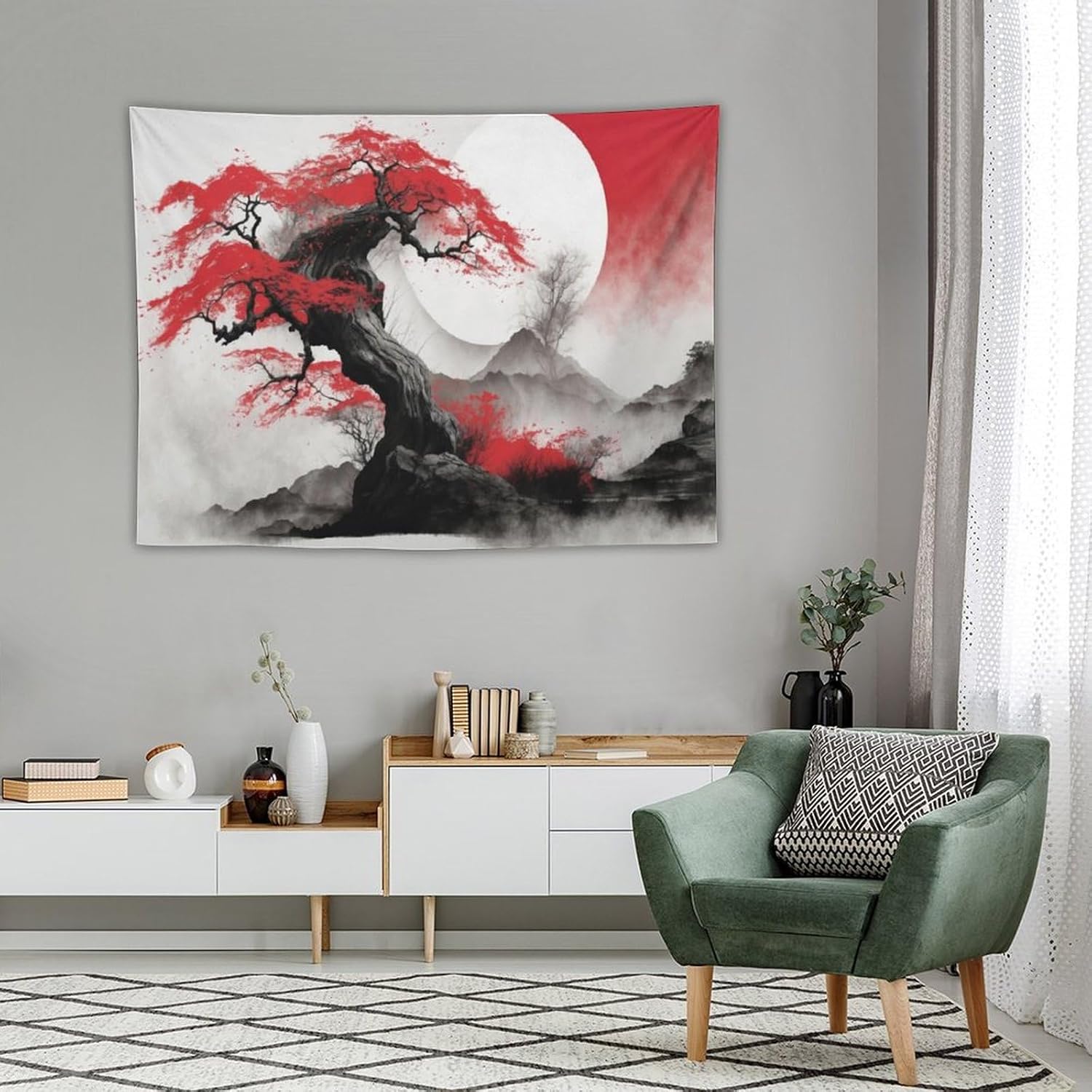 Cherry Blossoms Tapestry, Japanese Red Landscape Asian Abstract Art, Bedroom Living Room Decor 40"x30"