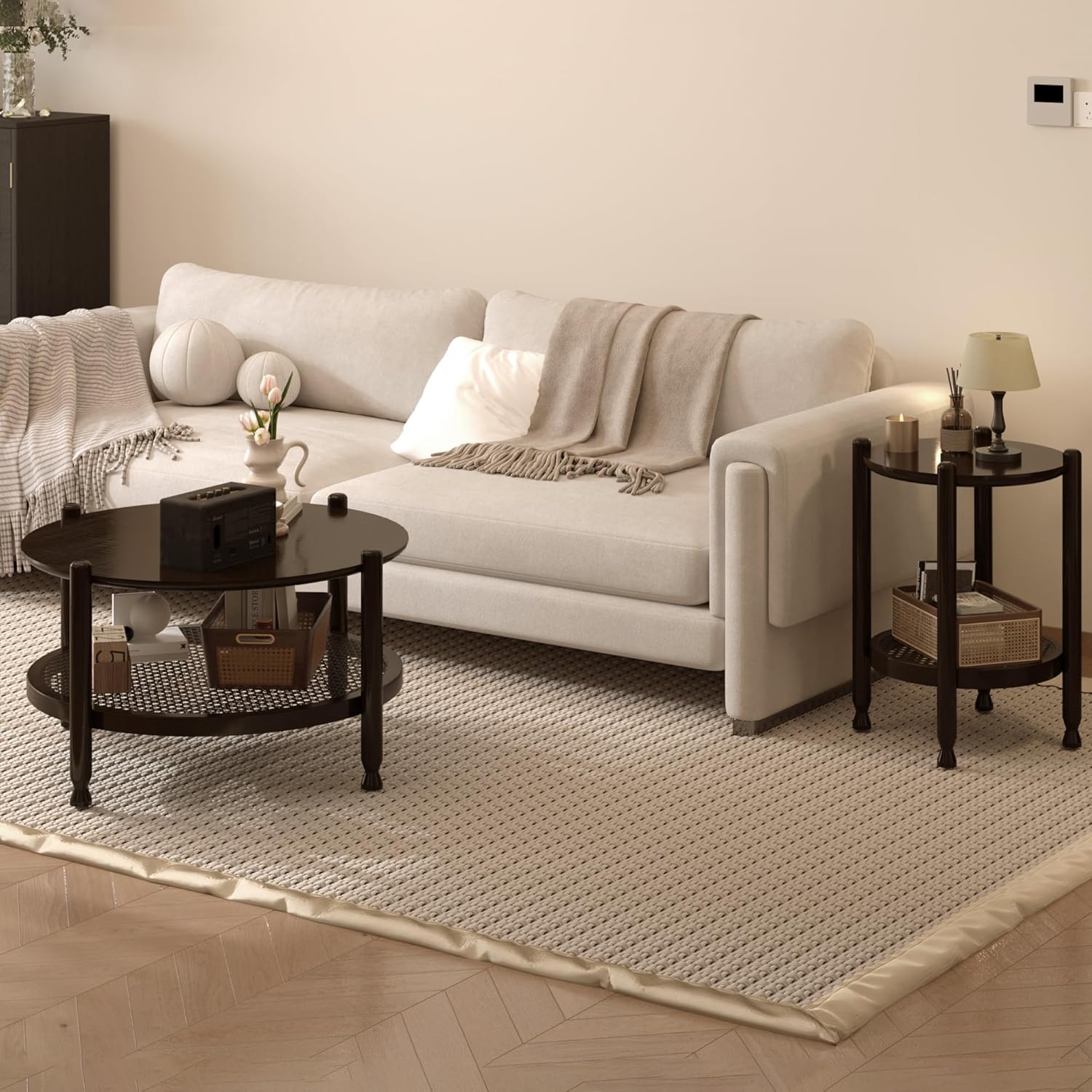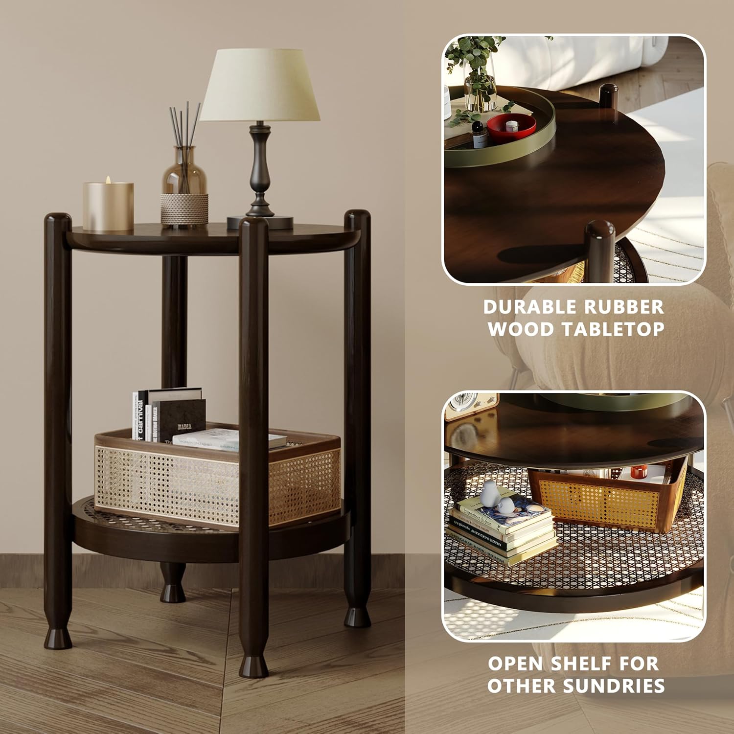 NSdirect Round End Table for Living Room, 2-Tier Rustic Wood Center Table for Home Decor with Boho Woven Rattan Storage Shelf | Modern Farmhouse Design, Easy Assembly, Black Brown