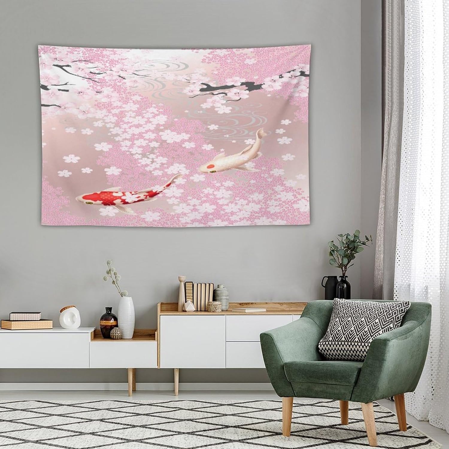 Houselerax Japanese Koi Fish Tapestry, Cherry Blossoms Asian Oriental Pink Flower Branch Koi Fish Carp Tapestries Wall Hanging for Bedroom Living Room Office Decor 90"x60"