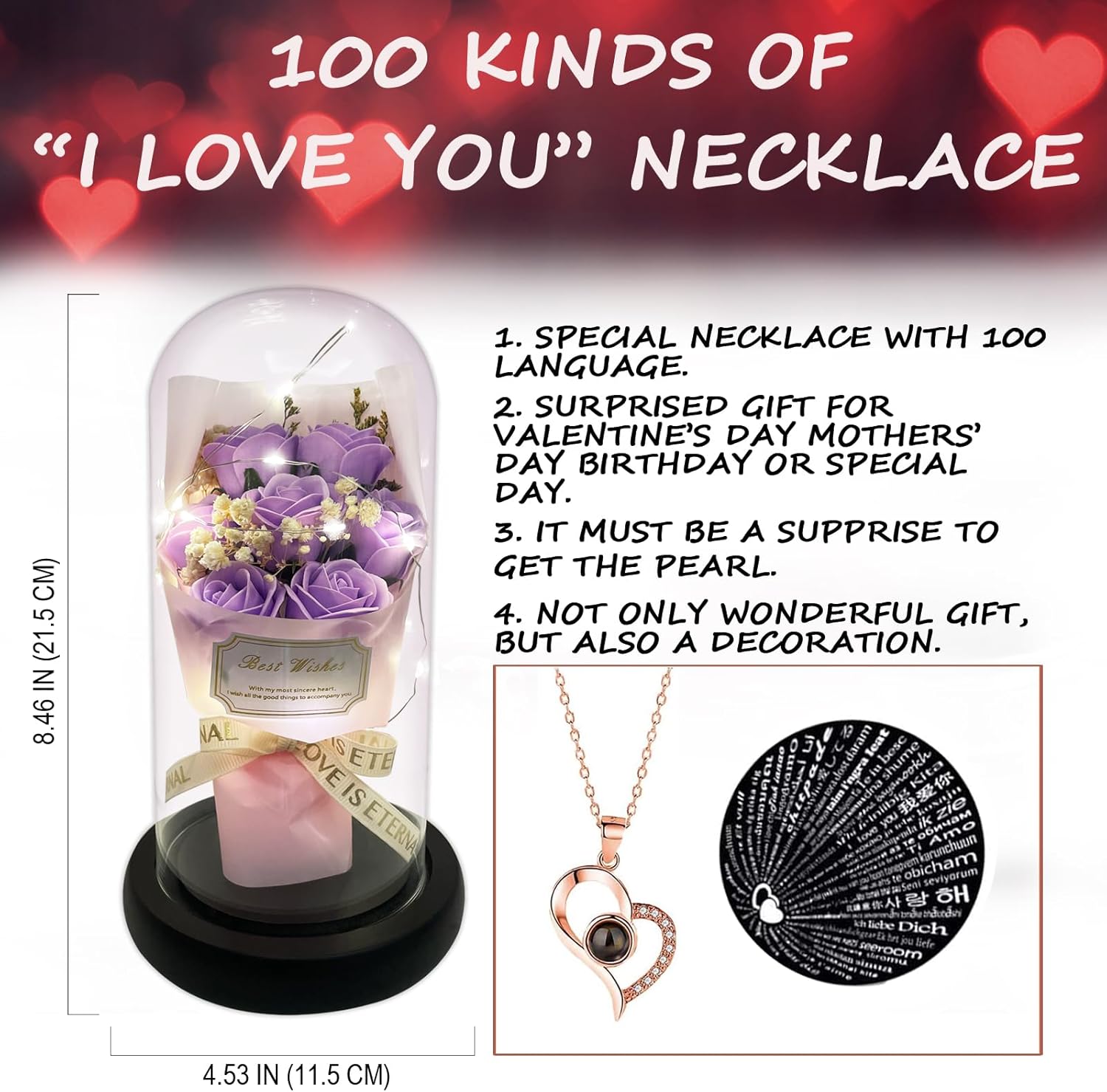 Gift for Her Forever Flower Bouquet for Delivery Prime Preserved Purple Roses Glass Dome LED Light 100 Languages I LOVE YOU Necklace Mothers Day Birthday Romantic Valentines Gift for Wife Women Mom