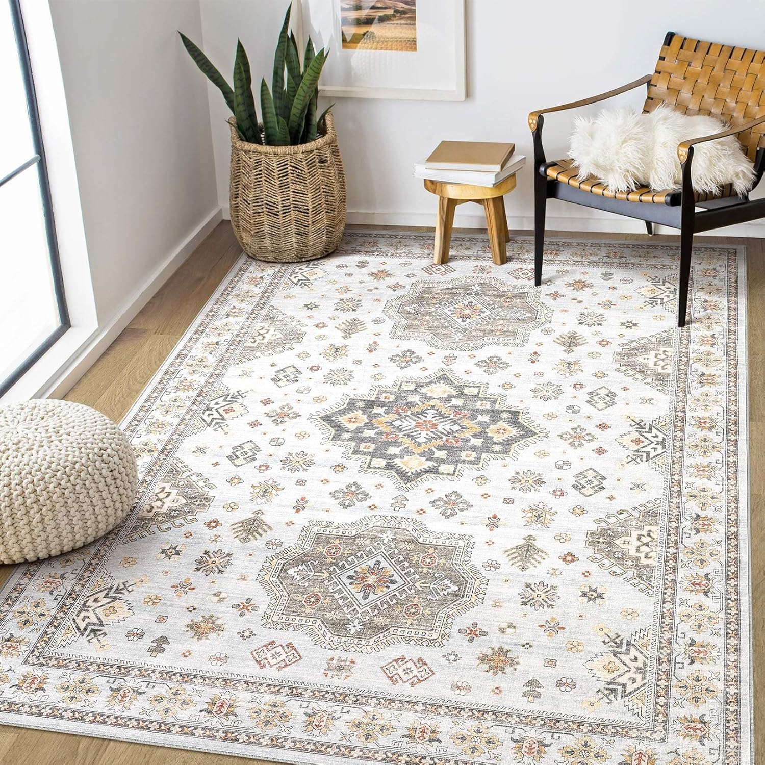 Washable Area Rugs for Living Room - 5x7 Neutral Vintage Distressed Floral Farmhouse Boho Large Soft Floor Rug Indoor Non Slip Carpet for Living Room Bedroom Dining Room Office - Blue Brown