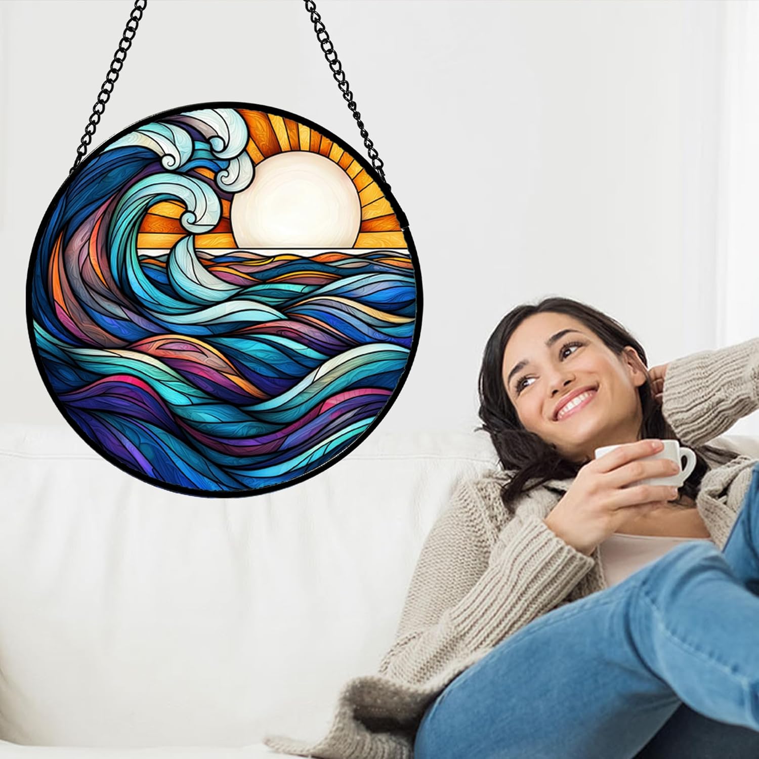 Stained Glass Window Hanging, Big Wave Sun Suncatcher Diamond Glass Panel Hangings Abstract Sun Catchers Decor for Birthday for Women, Men, Wife, Aunt, and Mom 14.9x14.9 in