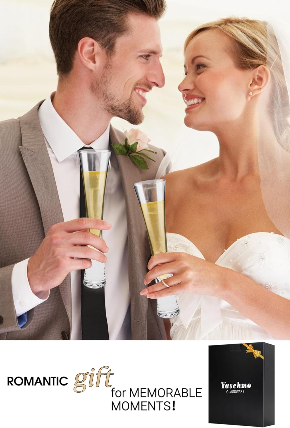 - 【Elevate Better Sipping Experience】Yaschmo champagne flutes set of 2 is made from 100% lead-free crystal clear glass, with 99% higher transparency, revealing the lively dance of bubbles and rich hues of your beverage.The carefully cut and polished rims creats naturally pleasant sipping experience on your lips when every pour. Practicality meets luxury: They are dishwasher-safe.