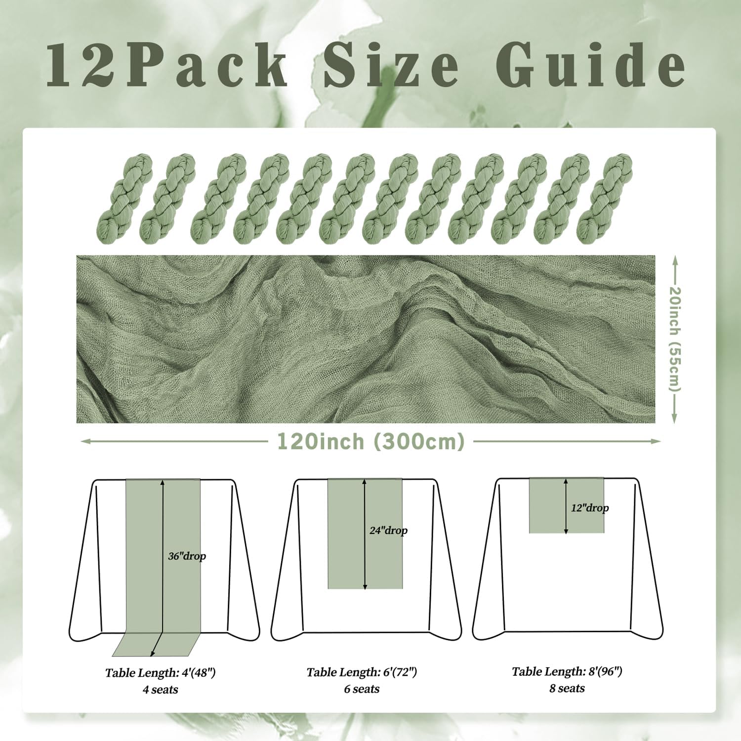 12 Pack Sage Green Cheesecloth Table Runner 10FT Rustic Gauze Fabric Cheese Cloth Table Runner for Wedding Bridal Baby Shower Table Decor 20 x 120 Inch Long Boho Sheer Birthday Party Table Decorations