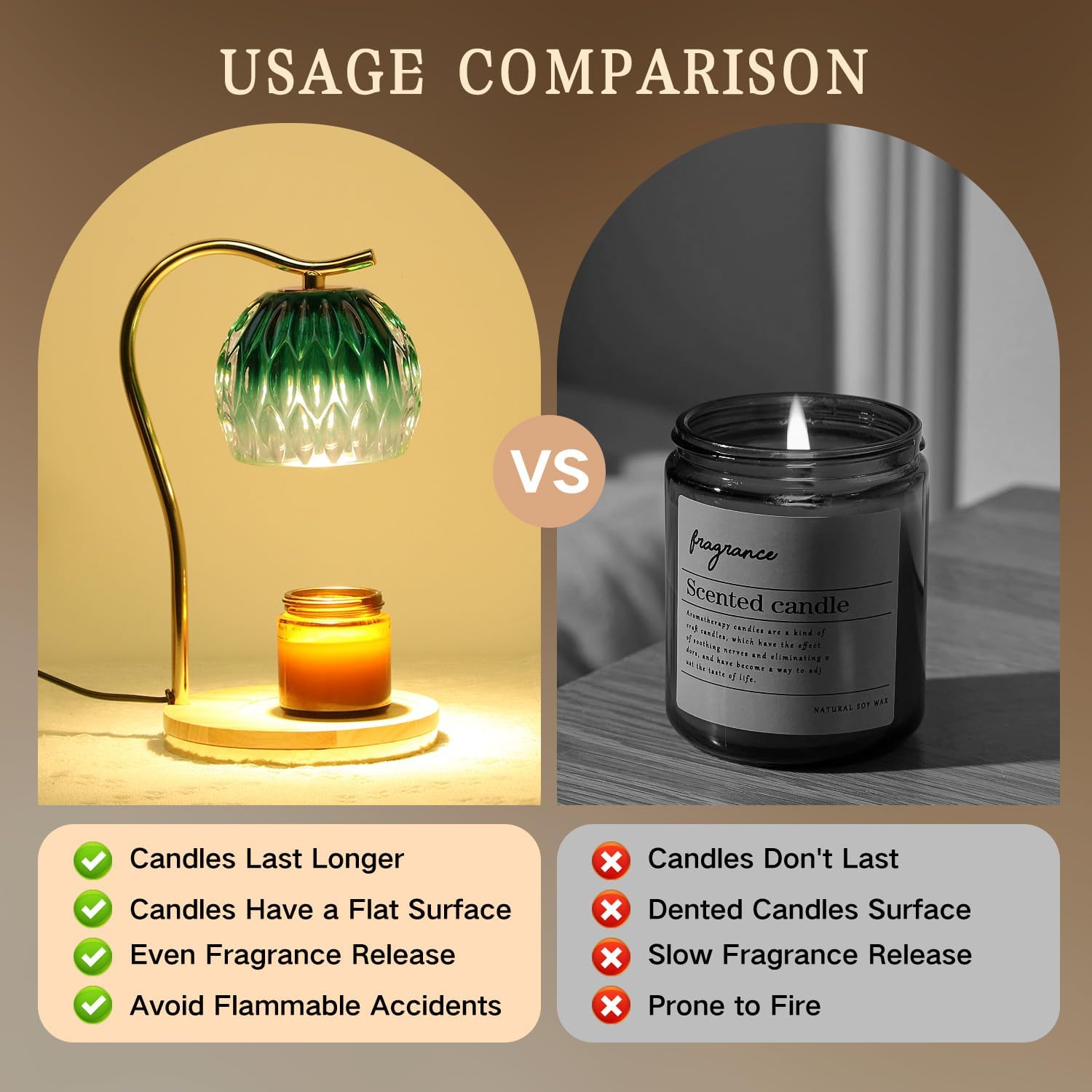 - 【Fit All Size Candles & Perfect Home Decor】The wax warmers with 6.6inch wooden base and height adjustment compatible with all size candles. Good choice for those who are in apartments not allowed open-flame candles. The candle warmer adopts a Retro style design and is a delicate functional decorative lamp, suitable for living rooms, bedrooms, offices, yoga rooms, cafes, etc. It can also be used as a bedside lamp to create a sleep-inducing atmosphere.