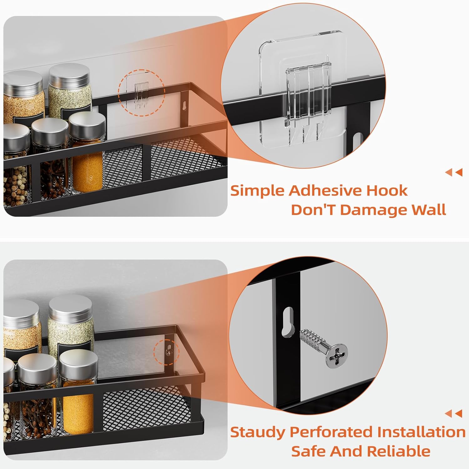 - Premium Metal Material and Stable Storage: The spice rack wall mounted is made of thickened high-strength carbon steel,is waterproof, rustproof, easy to clean.Our spice rack comes with additional 2.37-3.15 inch side guards and reinforced adhesive stickers to ensure safety and stability.