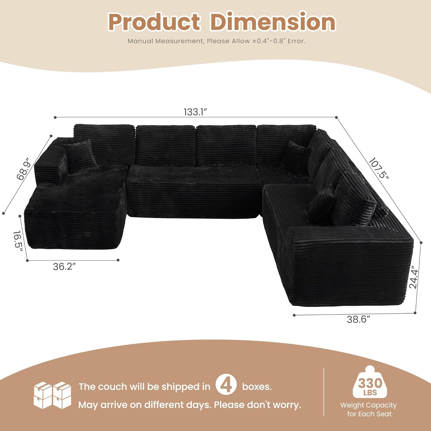 HOOOWOOO Cloud Sectional Couches for Living Room,Modular Sectional Sofa No Assembly,133X108 Inch Plush Corduroy Large U Shaped Floor Couch Set with Deep Seat Left Chaise(Black)