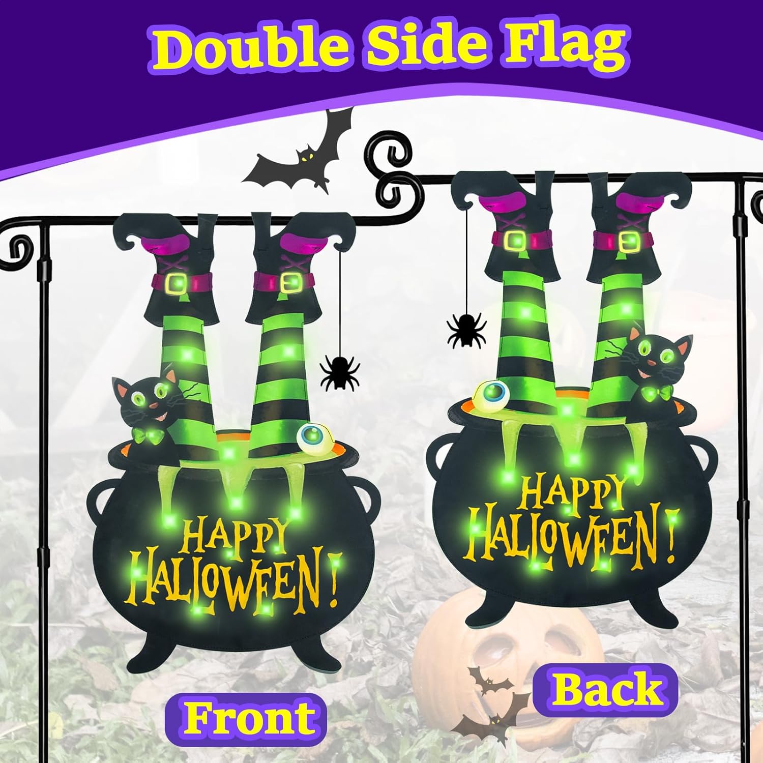 Halloween Lighted Garden Flag for Outside, Witch Feet Shape Flag Yard Decor, 8 Modes 12x18 Double Sided Cauldron Eyeball Black Cat Outdoor Hlloween Decorations for Home Porch