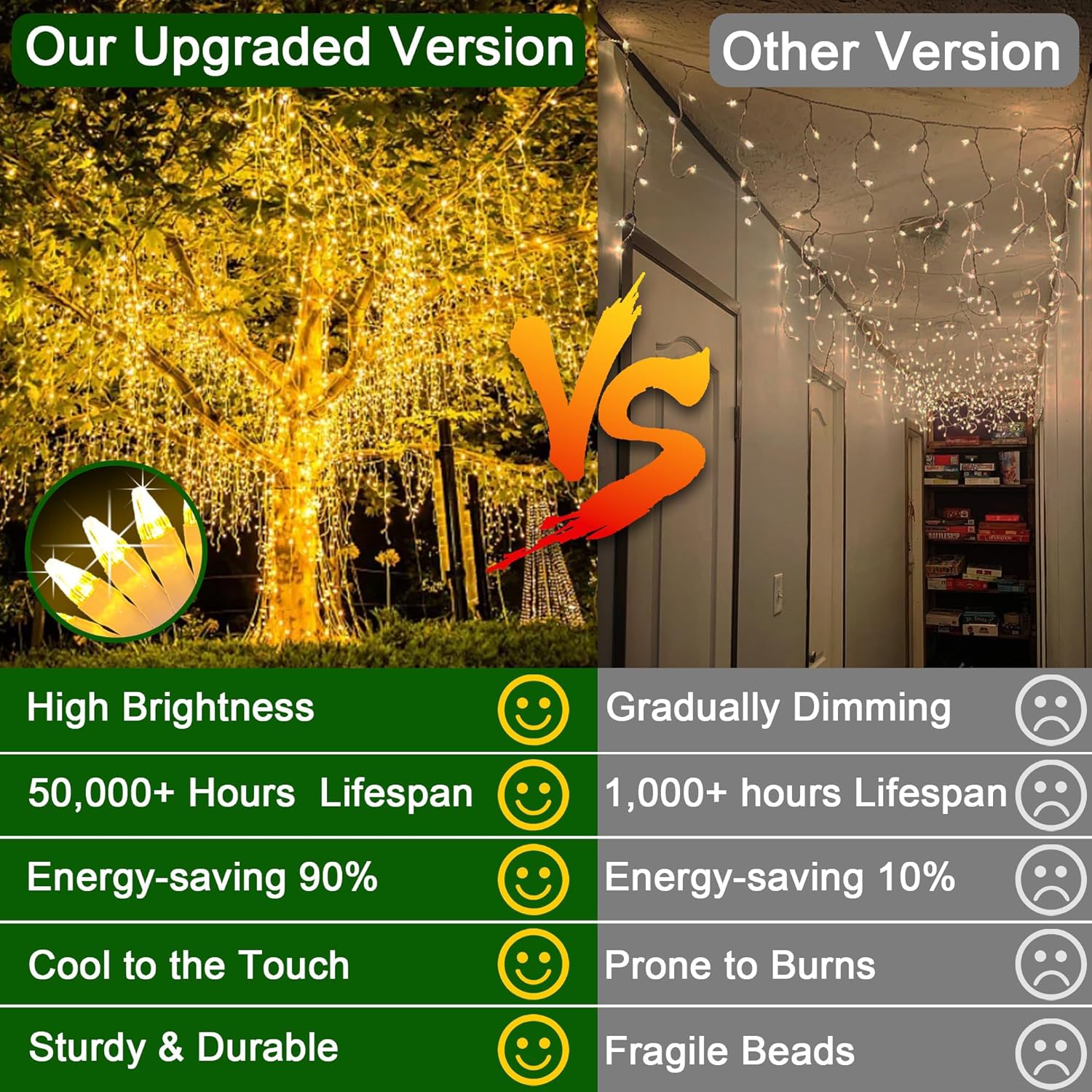 - Crafted to endure, these string lights boast a waterproof build and are composed of premium materials, incorporating advanced LED beads for even greater beauty and brilliance. Ideal for indoor or outdoor use, they can withstand the elements, be it rain or snow. With their long-lasting bulb life, you can look forward to many seasons of dazzling displays without the need for frequent replacements.