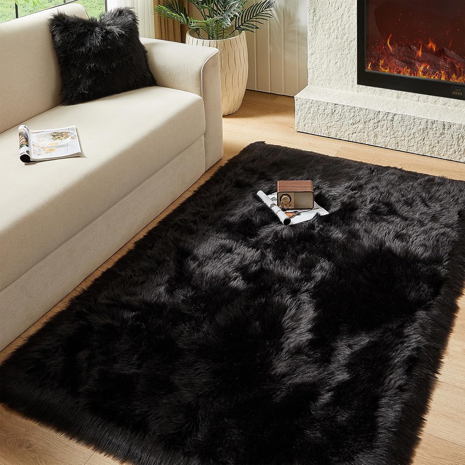 AMTOVO Faux Fur Sheepskin Rug for Living Room, 4 x 6 ft Black Fluffy Area Rug for Bedroom, Playroom, Luxury Room Decor, Rectangle