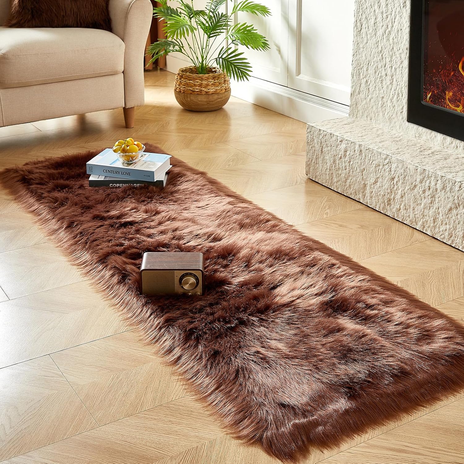 AMTOVO Faux Fur Rug, Coffee Ultra Soft Fluffy Shag Sheepskin Rug, 2 x 6 ft Runner Area Rugs for Bedroom Sofa Throw Cushion Room Decor, Rectangle