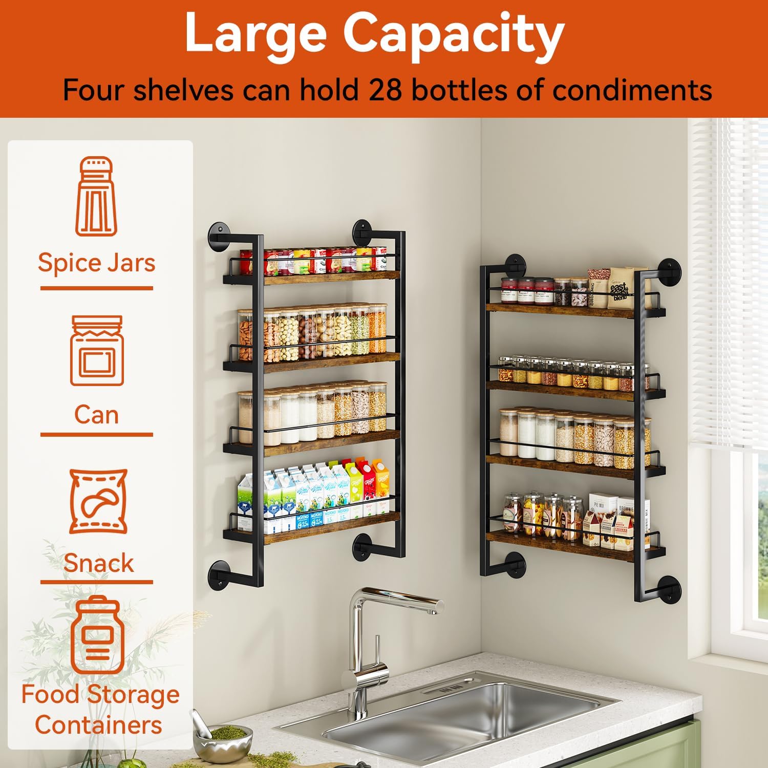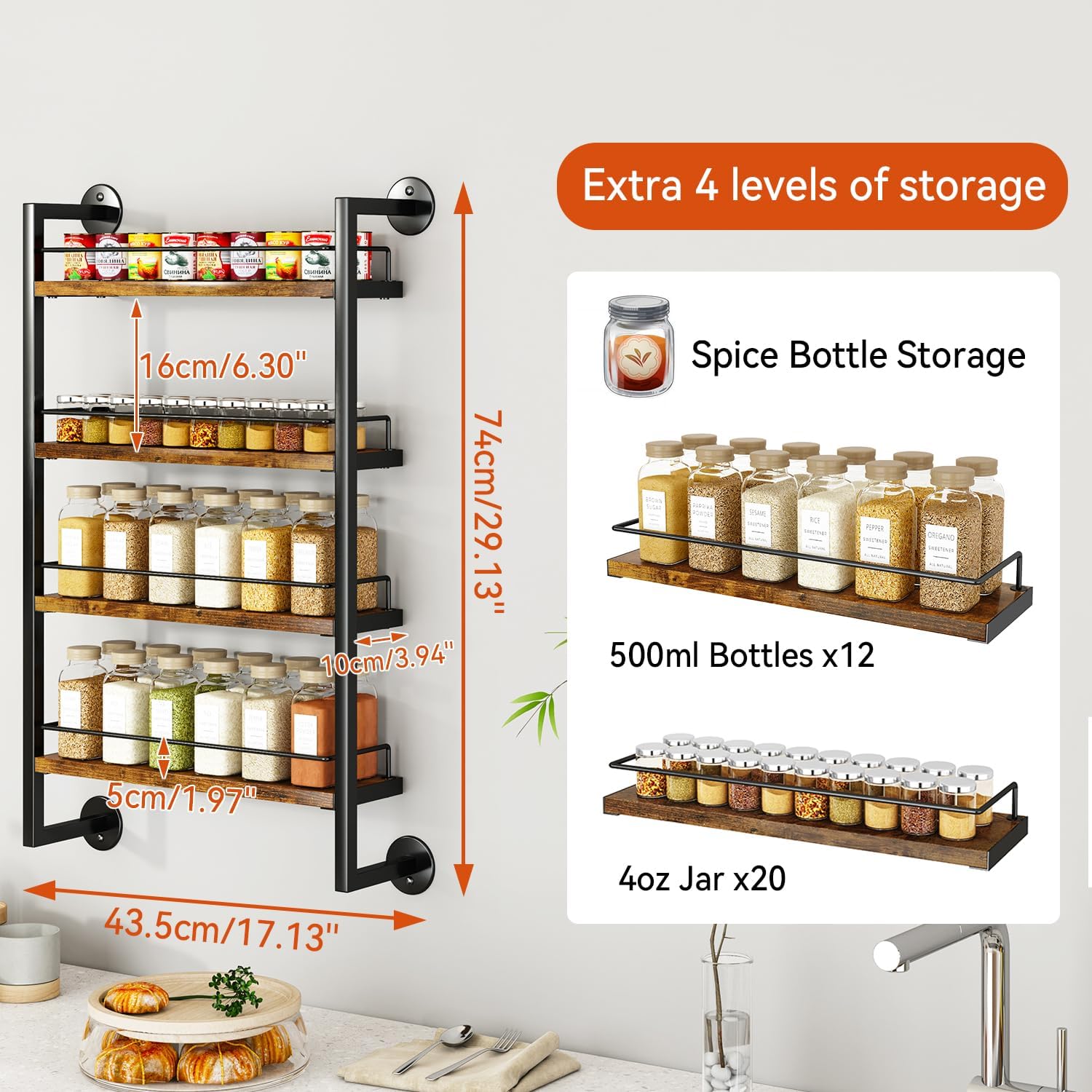- LARGE CAPACITY: Each spice rack holds 80 4OZ seasoning jars,or 20 500ml seasoning jars, but also big bottles and cans.; use the wall-mounted spice rack to keep your spices perfectly organized and easily accessible at all times.The wall spice rack Size is 17.13"L x3.94"W x 29.13"H.
