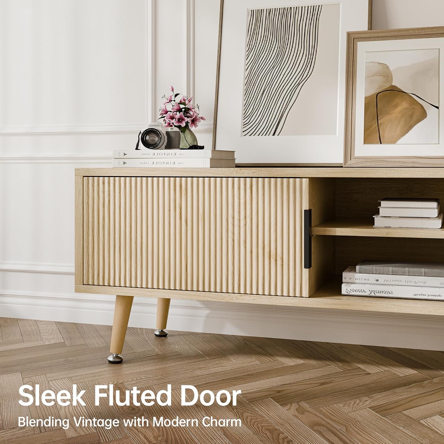 - 【Medieval-Style Modern TV Stand】 This media console table adds a touch of modern fashion to any home environment with its unique design elements—groove details, elegant curved contours, and natural wood grain, perfectly complementing and enhancing various decorative styles. Its simple yet elegant design seamlessly blends into living rooms, bedrooms, or offices.