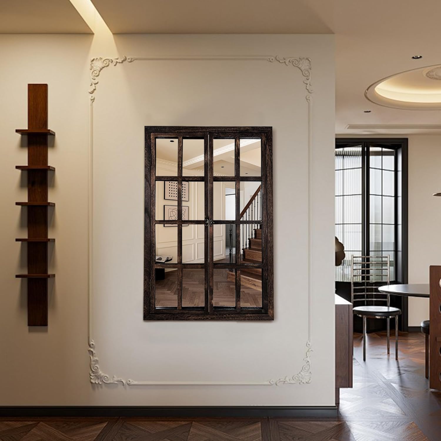 Wall Mirror with Window Design, 38"x26" Rustic Farmhouse Wood Mirror for Wall Decor, Decorative Vintage Mirror for Living Room, Bedroom, Entryway