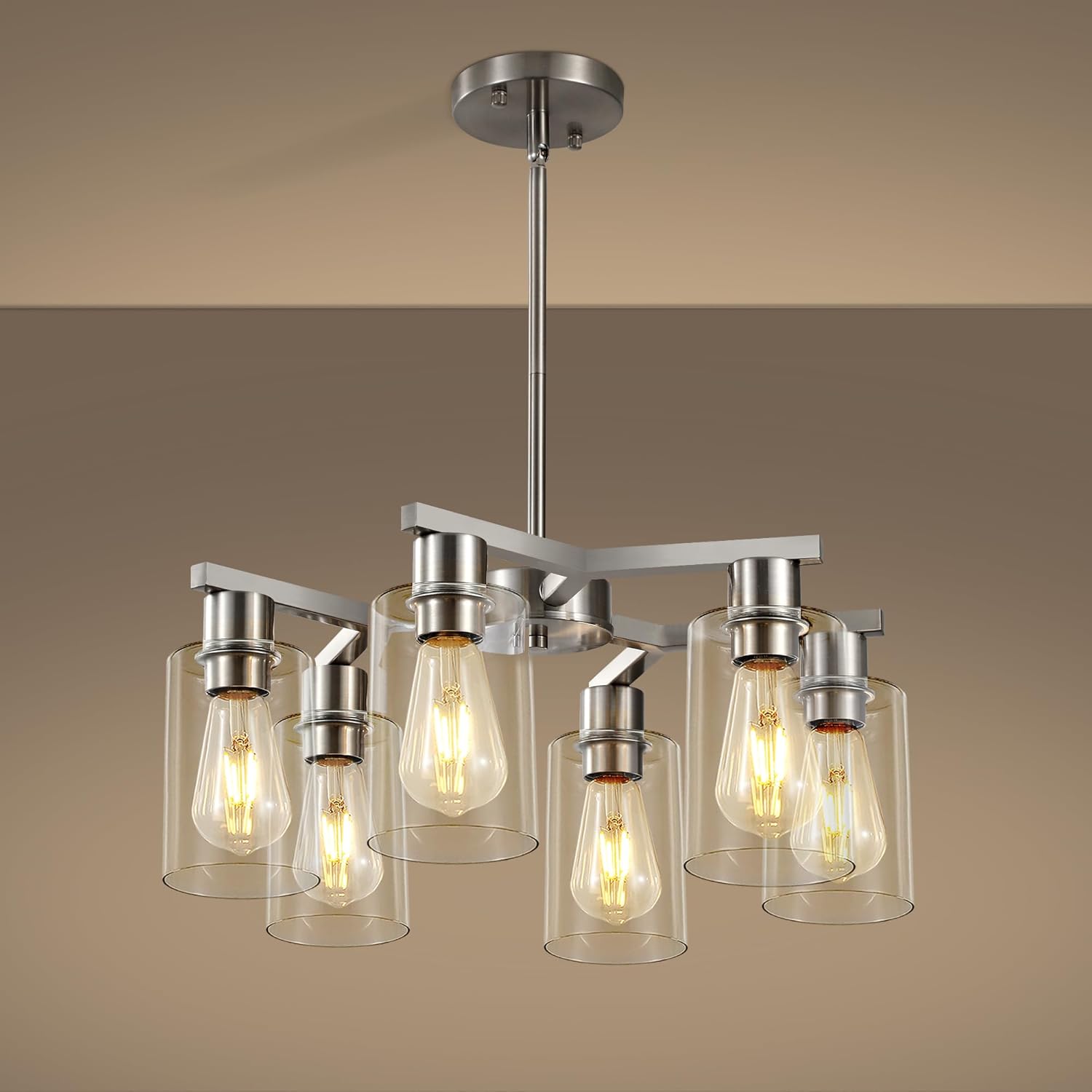6-Light Farmhouse Brushed Nickel Chandelier,Modern Chandeliers for Dining Room Light Fixture Over Table,Adjustable Hanging Industrial Rustic Pendant Lights Kitchen Island Light with Clear Glass Shade