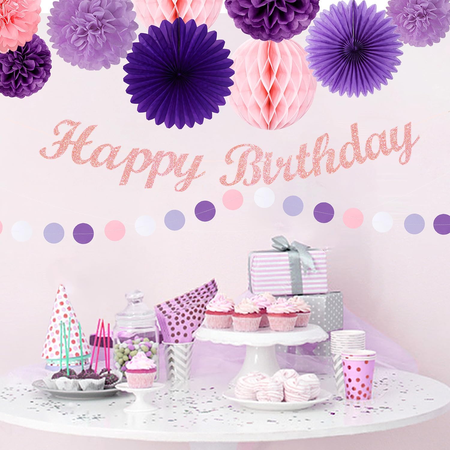 Purple Pink Birthday Party-Decorations Paper-Flowers - 14pcs Happy Banner Lavender Lanterns Tissue Pom Poms,Lilac Streamers Garland Fans Honeycomb,Women Girls Adult Kids Hanging Supplies Decor Hugfond