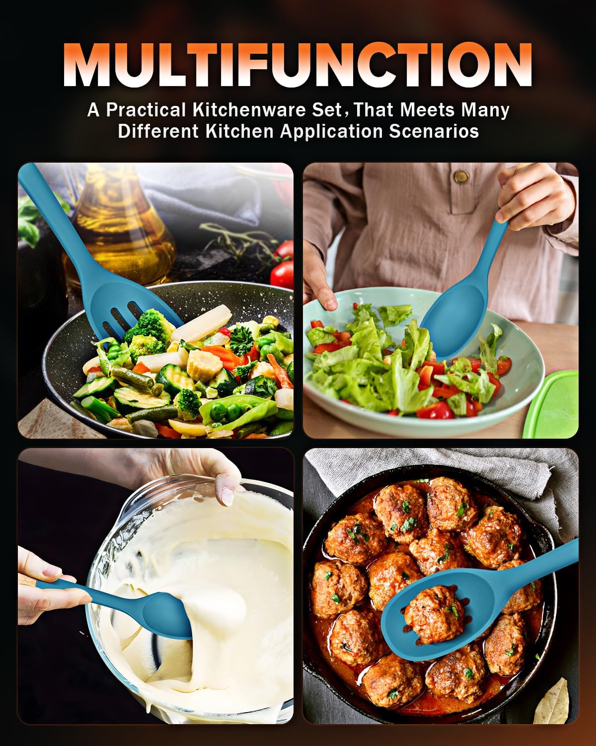 Silicone Cooking Spoons, Great for Scooping Sides and Serving Hearty Stews, BPA-Free Matte Silicone, Wooden Handle Serving Spoon for Nonstick Cooking Surfaces (Blue)