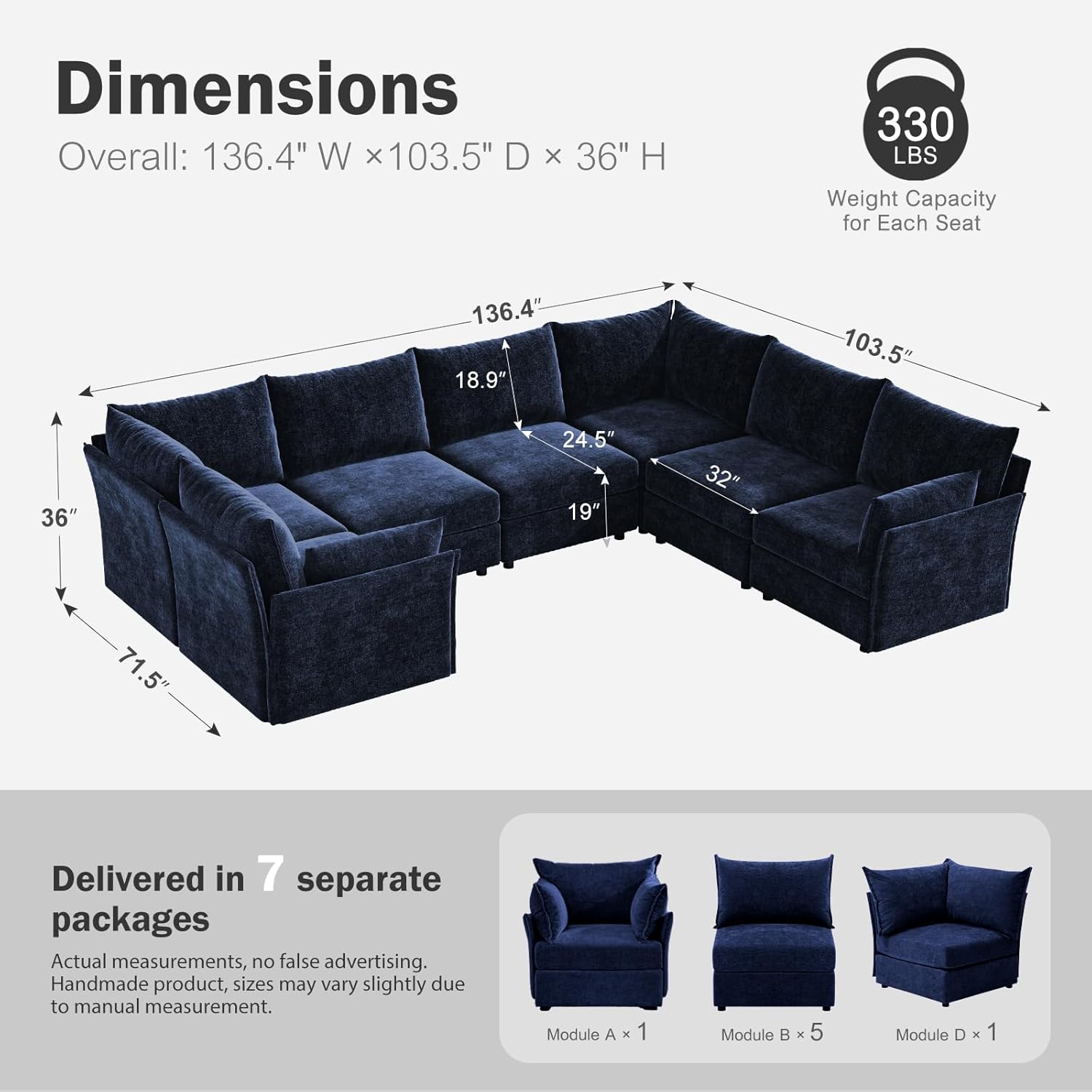 - 💡 Stylish and Spacious Sectional Sofa - A blend of modern elegance and comfort, this blue sofa is ideal for contemporary interiors. Customize seating and shape by adding or removing modules to fit your needs. It's perfect for your living room, family room, bedroom, or office. Overall size: 136.4" W × 103.5" D × 36" H, seat width: 32", seat depth: 24.5".