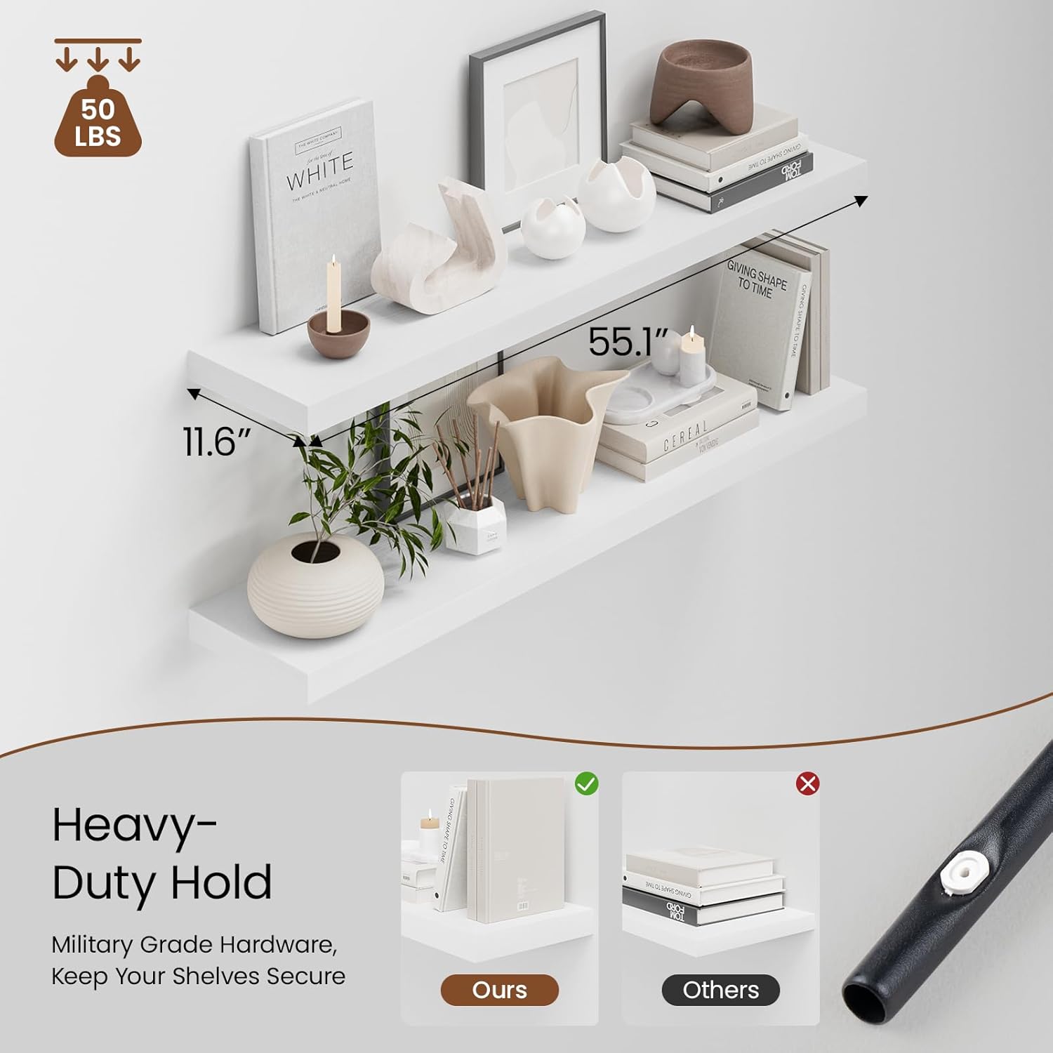 - Extra Deep Floating Shelves: Measuring 11.6” D x 55.1” W x 1.5” H, these shelves are crafted for maximum depth and durability. The spacious 12” depth gives you plenty of room for stylish display, organized storage, and decorative accents. Perfectly suited for your bathroom, kitchen, or living room, they enhance both function and flair in any space!