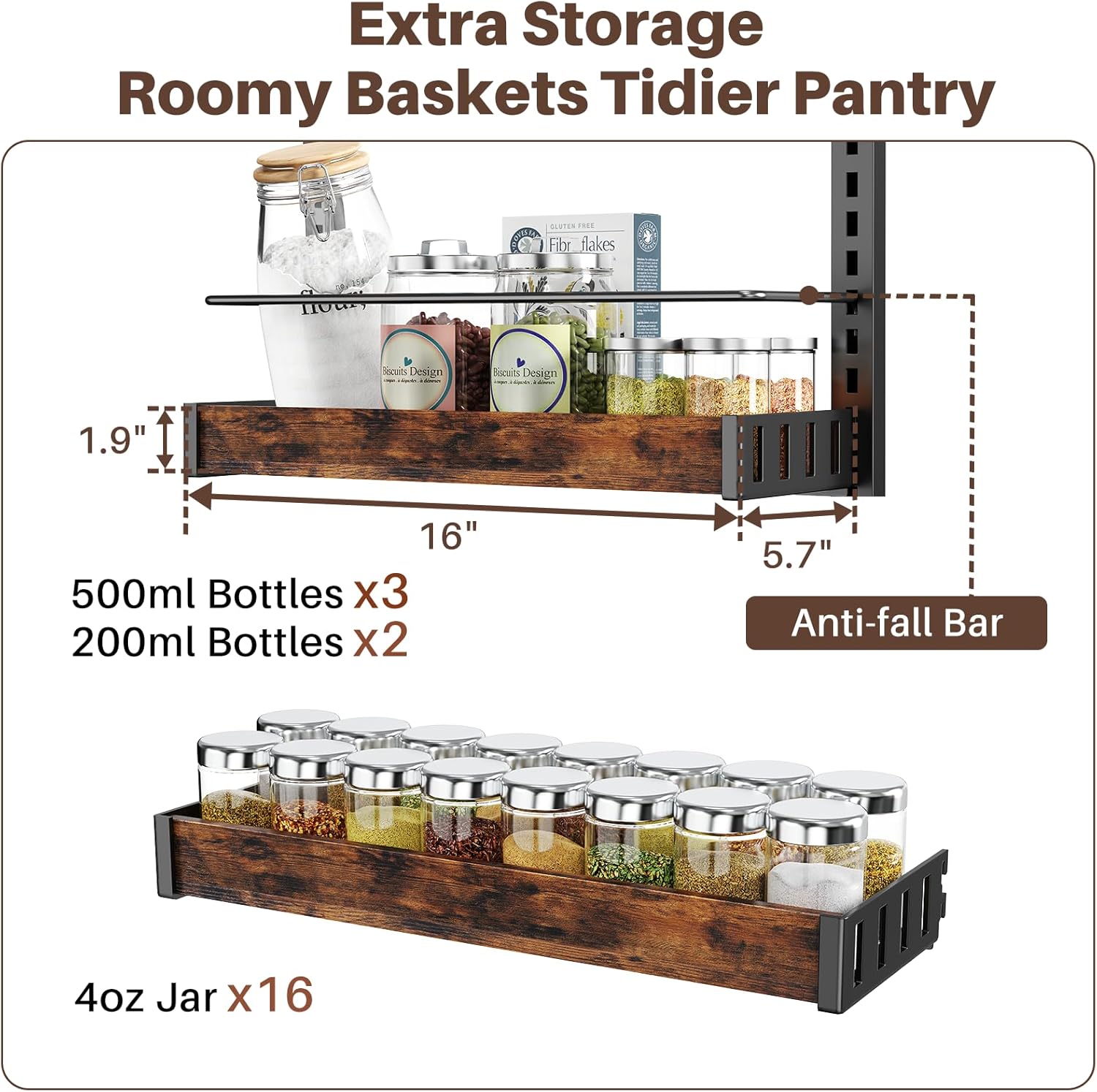 - Elevated Style for Everyday Storage: Designed with a rustic wood panels and sleek metal baskets, this seasoning organizer blends function with decor—perfect for farmhouse, modern, or cozy spaces