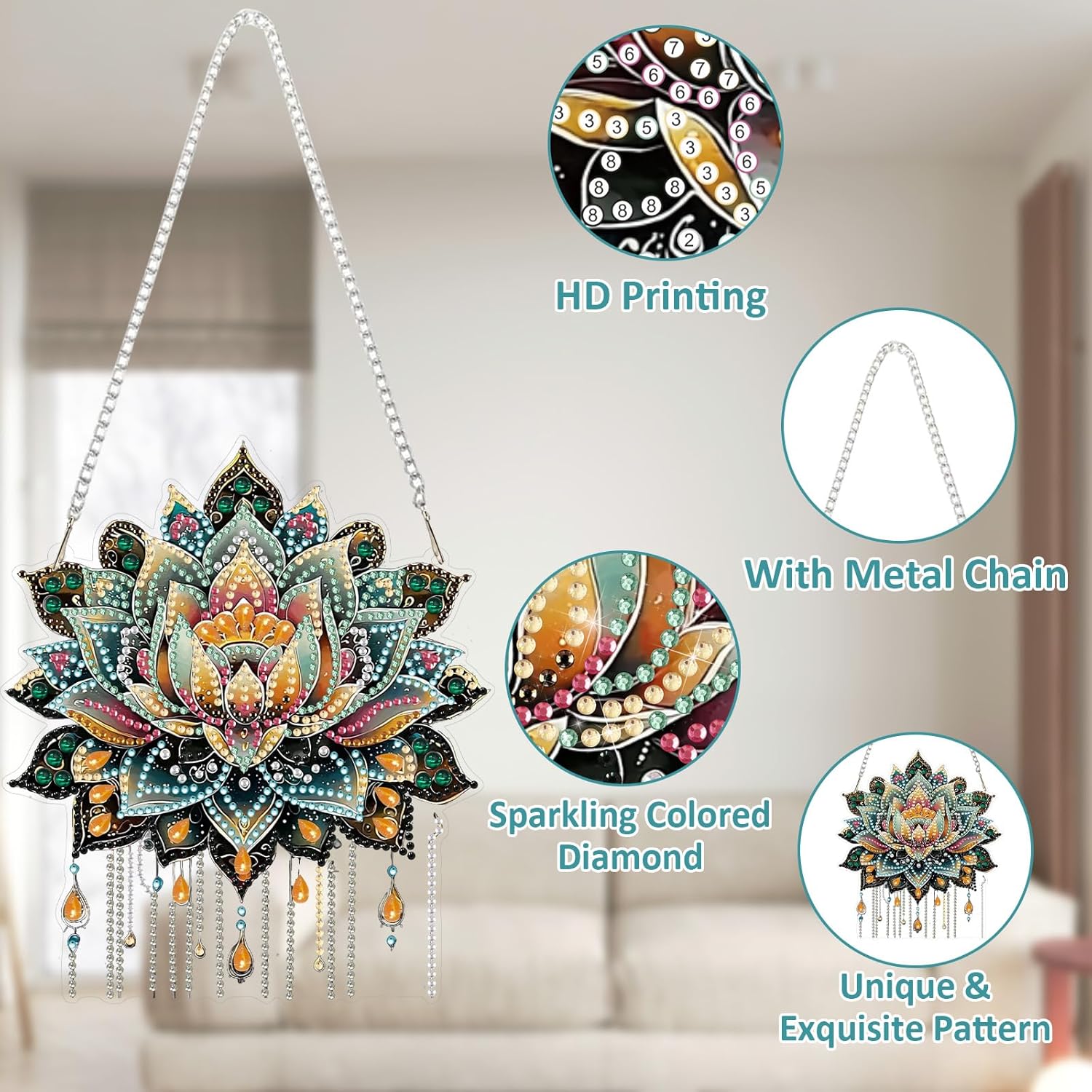 SENQAO Lotus Diamond Art Hanging Kit for Adult, Special Shaped Rhinestone, Double Sided DIY Acrylic Diamond Art Painting Window Pendants Home Garden Wall Hanging Kits Hanging Ornament
