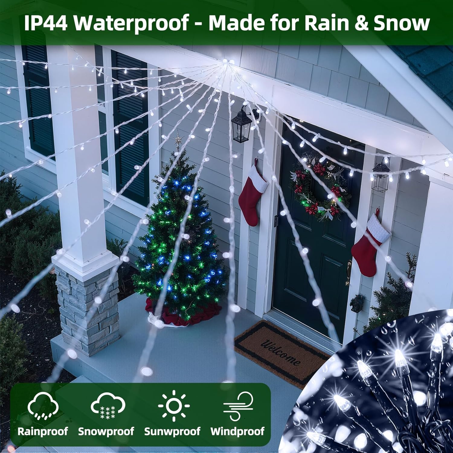 - Outdoor Waterproof: Winter weather won’t ruin your holiday spirit. These waterproof holiday lights lights handle rain, snow, frost, and sleet with ease. The outdoor Christmas lights blends naturally with trees, garlands, and wreaths, leaving only the glow. Perfect for rooftops, fences, porches, or balconies, they keep your home shining through the entire season. From Christmas decorations and New Year’s Eve parties to summer BBQs, these fairy lights deliver year-round sparkle