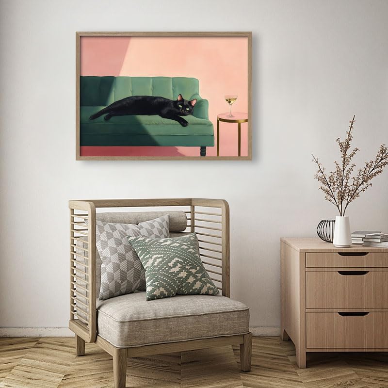 - Casual Style Black Cat Art: This painting shows a black cat lazily lying on a green sofa, with a warm pink background, giving any space a relaxing and pleasant atmosphere, perfect for modern homes.