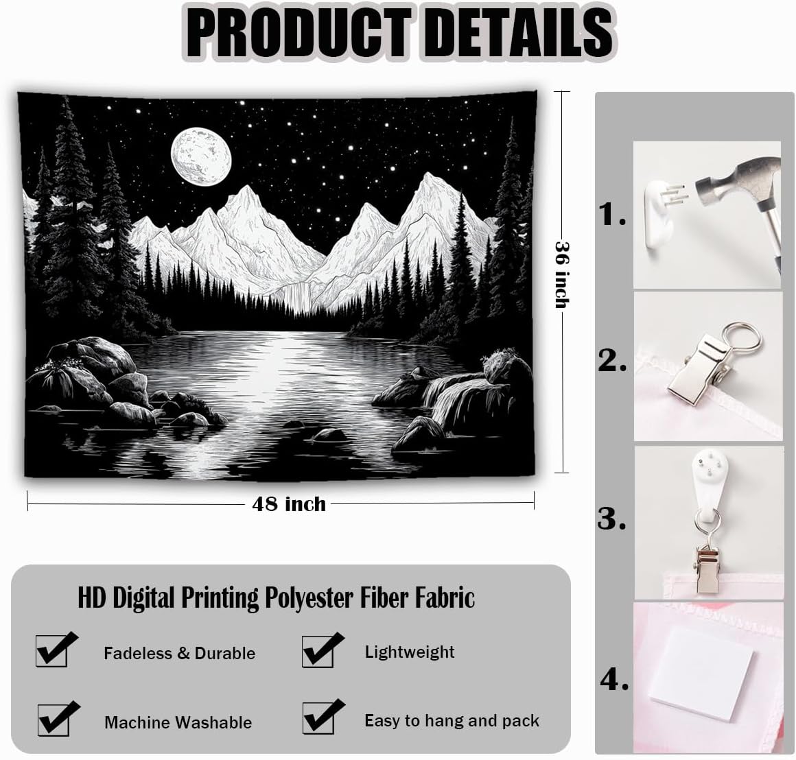 - Unique Black and White Design: The Starry Night Mountain and Lake tapestry features a stunning black and white design, with detailed mountains, forests, and a tranquil lake under the moonlight. This unique aesthetic brings a sense of peaceful nature to your space