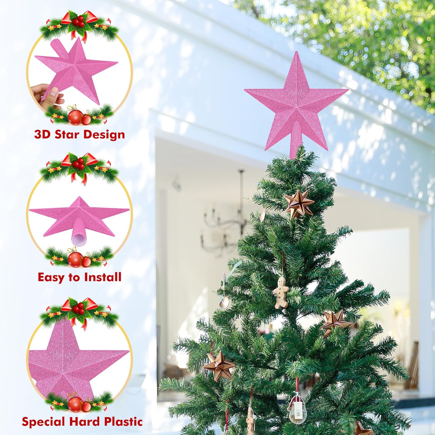 Christmas Tree Decoration, 8" Pink Christmas Tree Topper Star Accessories, Xmas Glitter 3D Bethlehem Tree Ornament, Waterproof Holiday Christmas Tree Topper Star Decorations for Home Indoor Outdoor