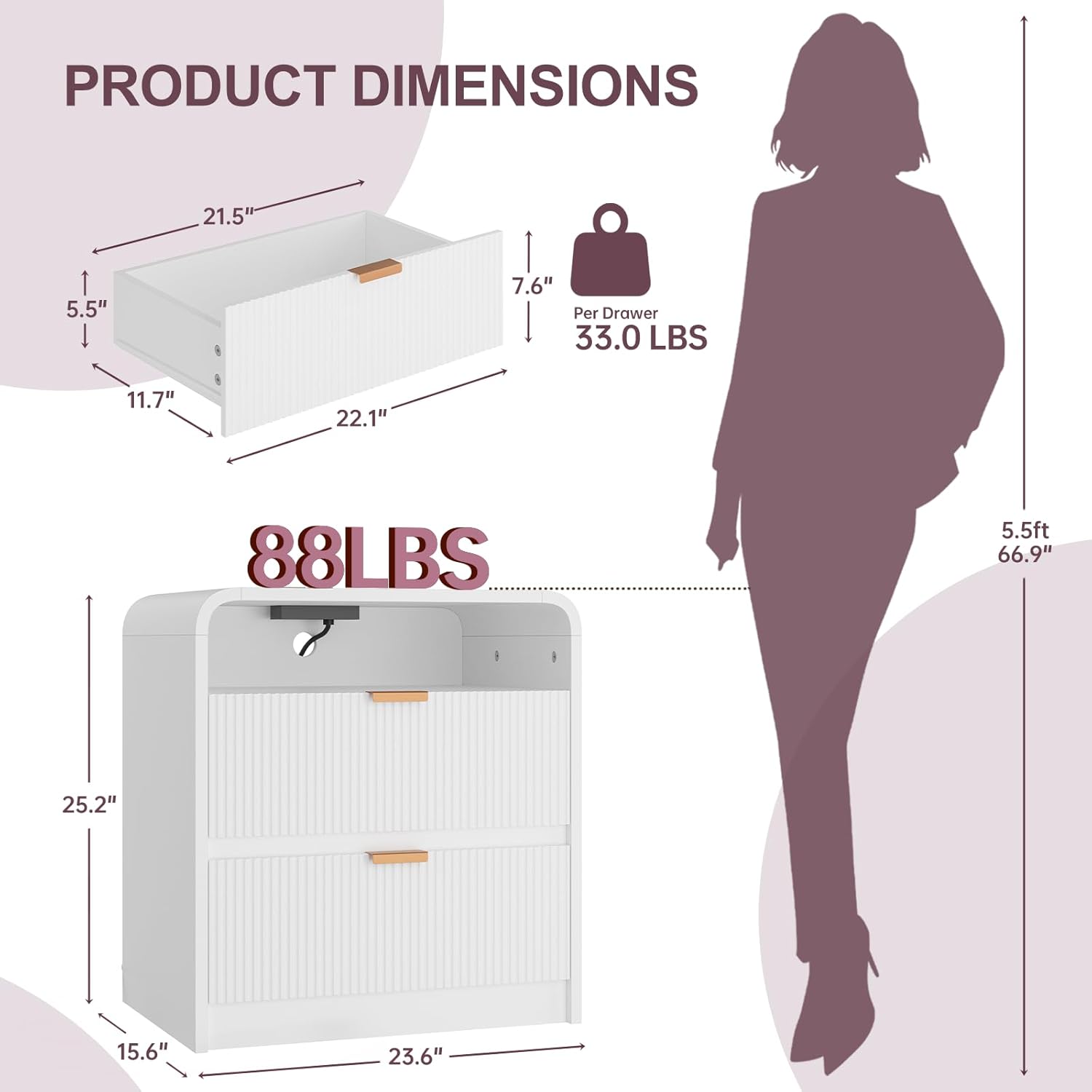 FURSUN 24" Fluted Nightstand Set of 2 with Charging Station, Wooden End Table with 2 Drawers Storage, Curved Profile Design, Modern Bedside Cabinet for Bedroom Living Room, White